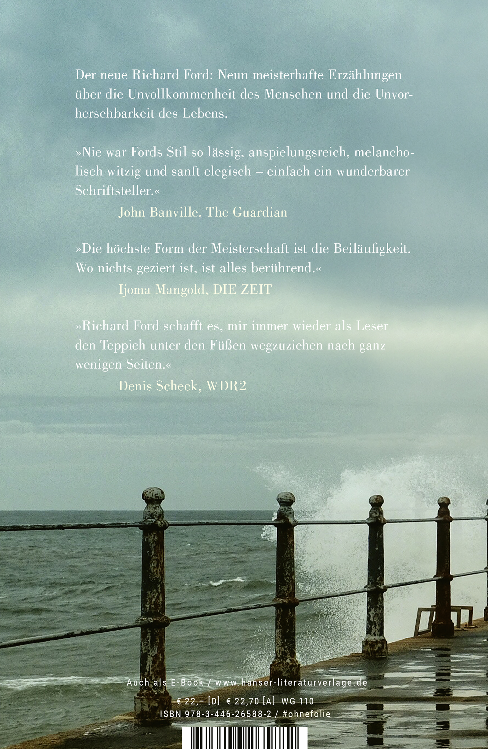 "Wenn Leonard Cohen einst sang, dass da ein Riss in allen Dingen sei und das genau dort das Licht hereinströme, dann könnte man damit Fords Stories beschreiben. All den Protagonisten ist der Knacks, der Riss, der Verlust gemeinsam. … Es gibt diese, scheinbar beiläufigen, großartigen Richard-Ford-Sätze, die einen voll erwischen. Sätze, die man sich notieren, die man anderen vorlesen möchte. … Meisterhafte Kurzgeschichten." Stefan Maelck, MDR Kultur, 22.09.20