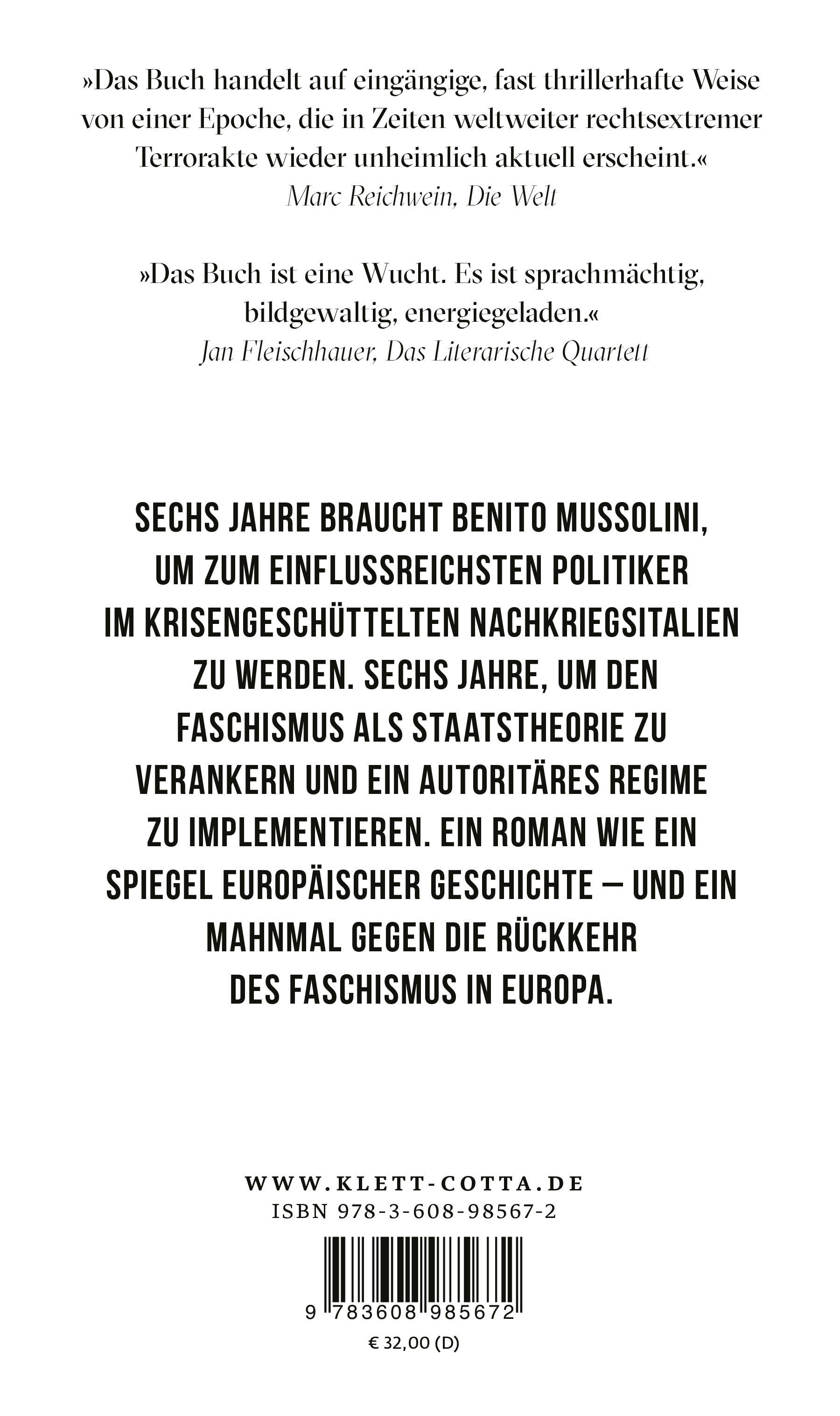 Sechs Jahre braucht Benito Mussolini, um zum einflussreichsten Politiker im krisengeschüttelten Nachkriegsitalien zu werden. Sechs Jahre, um den Faschismus als Staatstheorie zu verankern und ein autoritäres Regime zu implementieren. Ein Roman wie ein Spiegel europäischer Geschichte - und ein Mahnmal gegen die Rückkehr des Faschismus in Europa.