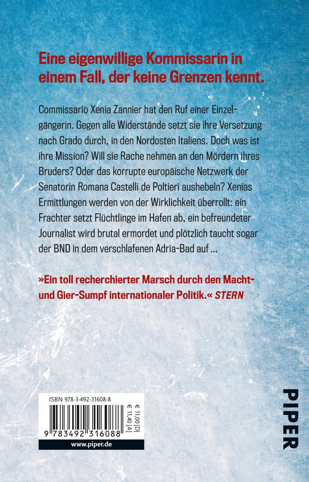 Commissario Xenia Zannier will sich an den Mördern ihres Bruders rächen. Ihr Hass gilt der skrupellosen Senatorin Romana Castelli, deren korruptes Netzwerk sich von Grado bis nach Rom, München und Rijeka erstreckt. Bald setzt ein Frachter syrische Flüchtlinge vor dem Adria-Bad ab, und ein befreundeter Investigativ-Journalist wird brutal ermordet. Die Spur führt Xenia vom BND zu Waffenschiebereien über Kroatien in den Nahen Osten. Bei der Senatorin laufen alle Fäden zusammen, und Xenia ahnt, dass diese alles tun wird, um ihre Macht zu erhalten.