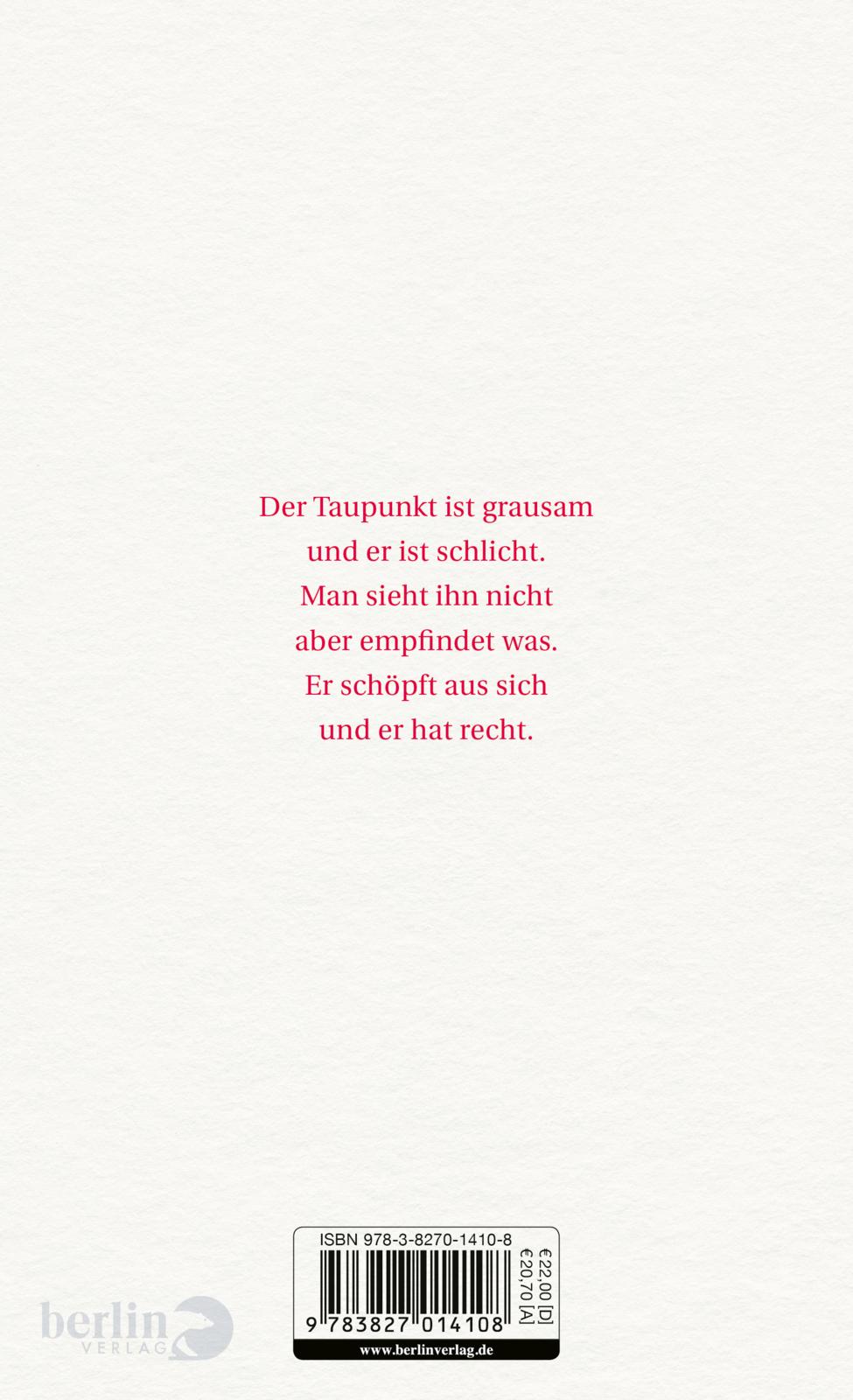 »Taupunkt« führt fort und beschließt, was mit Kerstin Preiwuß' Gedichtband »Rede« begann und in »Gespür für Licht« seinen Lauf nahm: Für die Dauer einer Nacht setzt der Tonstrom ein. Unerschrocken dringt er durch die Schichten des Ichs. Dort setzt das Dichten an und sucht Zusammenhang.