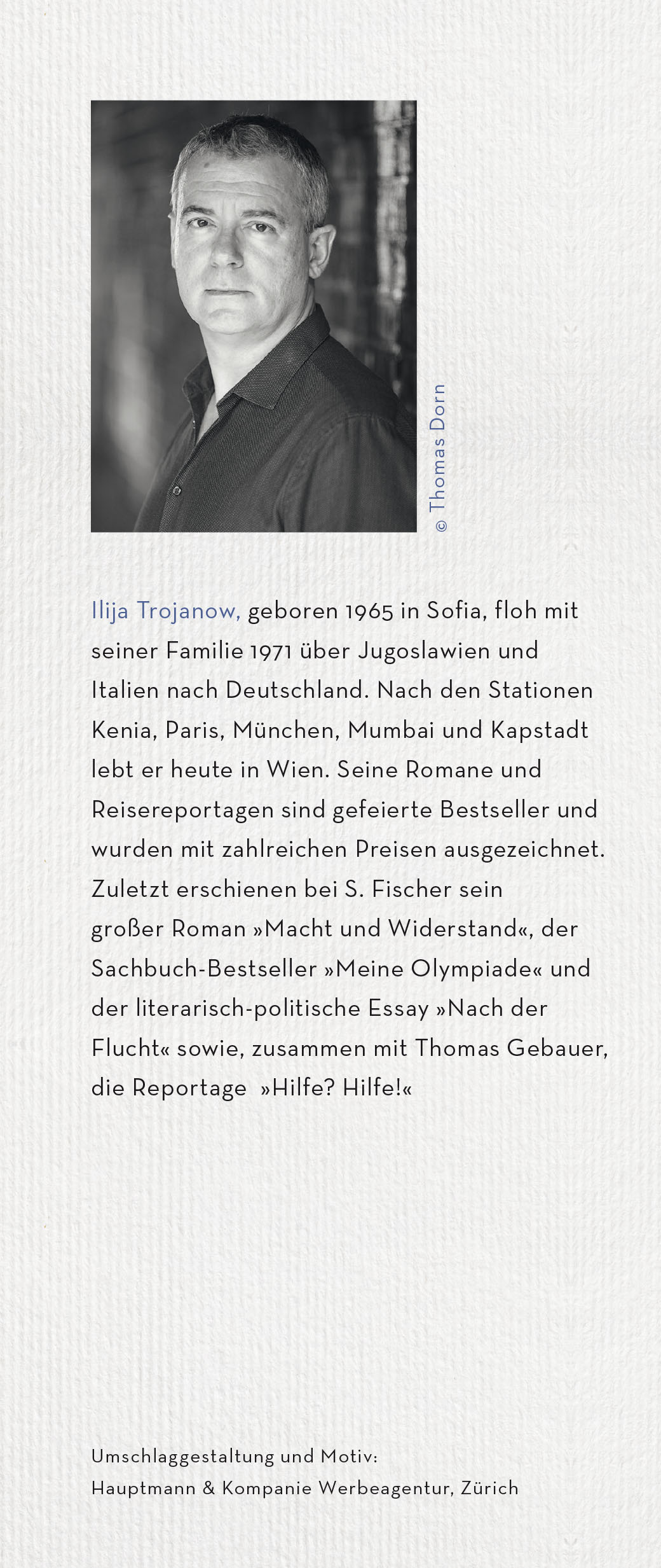 Ilija Trojanow, geboren 1965 in Sofia, floh mit seiner Familie 1971 über Jugoslawien und Italien nach Deutschland, wo sie politisches Asyl erhielt. 1972 zog die Familie weiter nach Kenia. Unterbrochen von einem vierjährigen Deutschlandaufenthalt lebte Ilija Trojanow bis 1984 in Nairobi. Danach folgte ein Aufenthalt in Paris. Von 1984 bis 1989 studierte Trojanow Rechtswissenschaften und Ethnologie in München. Dort gründete er den Kyrill & Method Verlag und den Marino Verlag. 1998 zog Trojanow nach Mumbai, 2003 nach Kapstadt, heute lebt er, wenn er nicht reist, in Wien. Seine bekannten Romane wie z.B. ›Die Welt ist groß und Rettung lauert überall‹, ›Der Weltensammler‹ und ›Eistau‹ sowie seine Reisereportagen wie ›An den inneren Ufern Indiens‹ sind gefeierte Bestseller und wurden mit zahlreichen Preisen ausgezeichnet. Zuletzt erschienen bei S. Fischer sein großer Roman ›Macht und Widerstand‹, sein Sachbuch-Bestseller ›Meine Olympiade: Ein Amateur, vier Jahre, 80 Disziplinen‹ sowie der literarisch-politische Essay ›Nach der Flucht‹.