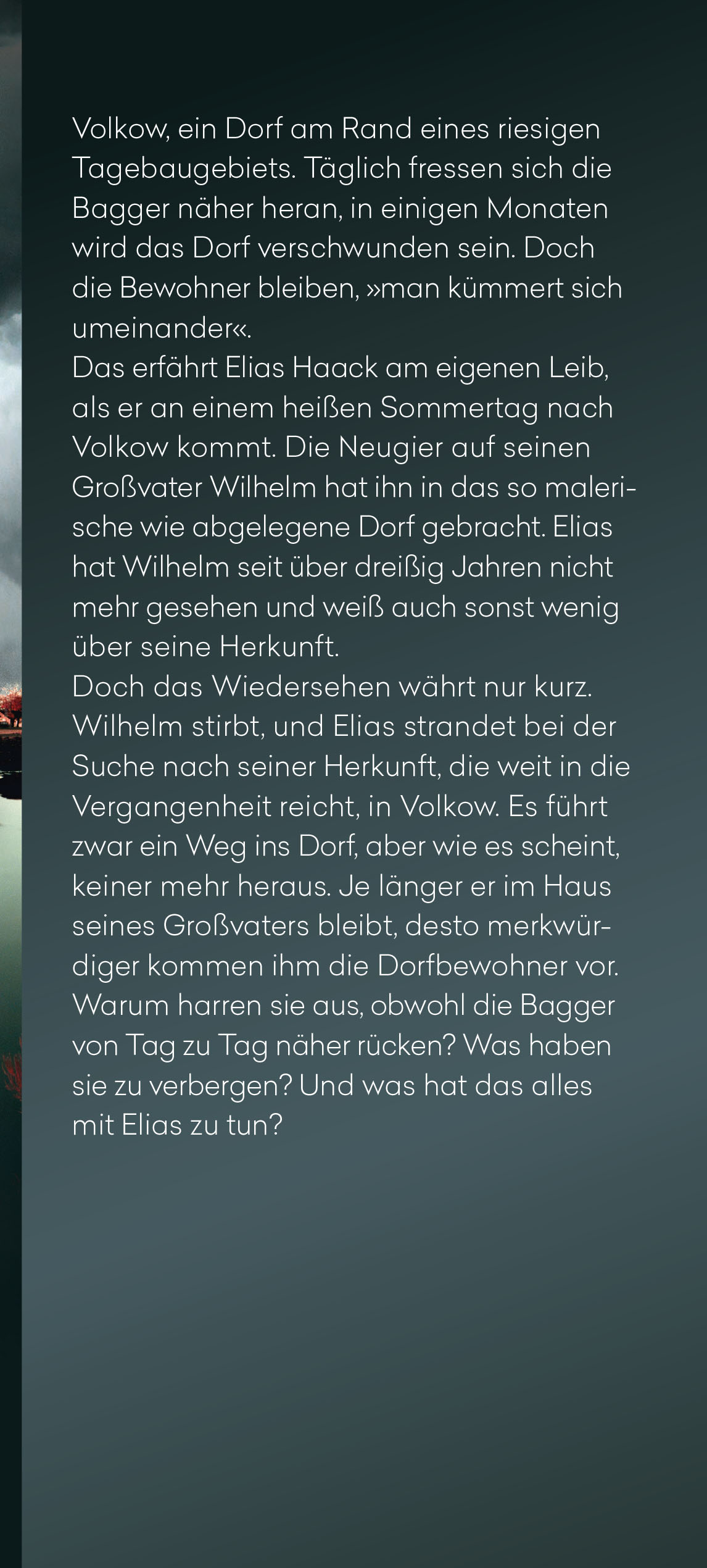 Je länger er im Haus seines Großvaters bleibt, desto merkwürdiger kommen ihm die Dorfbewohner vor. Warum harren sie aus, obwohl die Bagger von Tag zu Tag näher rücken? Was haben sie zu verbergen? Und was hat das alles mit Elias zu tun?