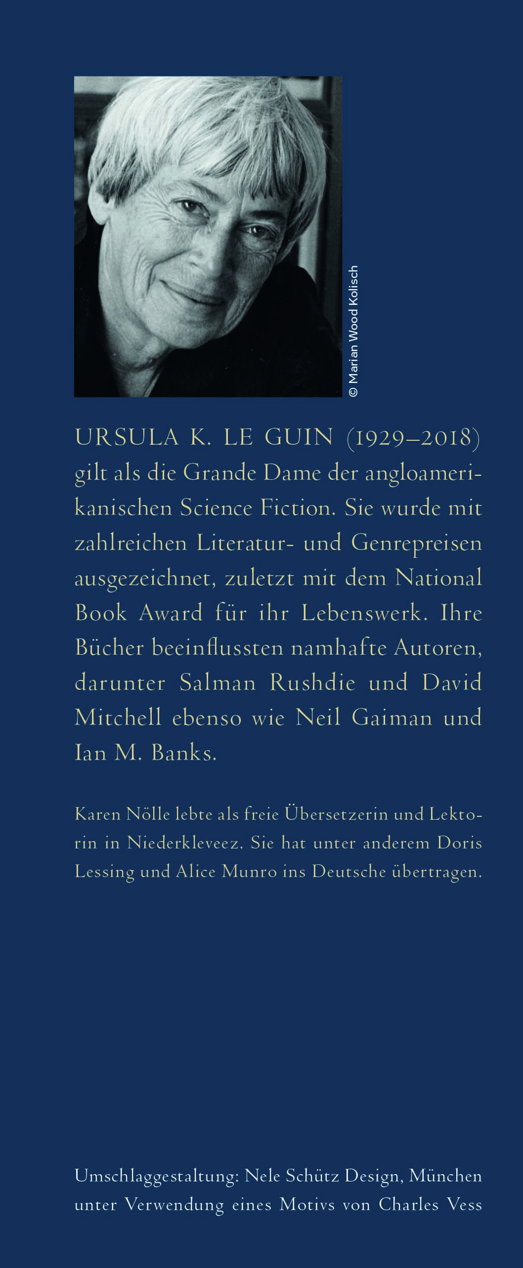 Ursula K. Le Guin (1929–2018) gilt als die Grande Dame der angloamerikanischen Science Fiction. Sie wurde mit zahlreichen Literatur- und Genrepreisen ausgezeichnet, zuletzt mit dem National Book Award für ihr Lebenswerk. Ihre Bücher beeinflussten viele namhafte Autoren, darunter Salman Rushdie und David Mitchell ebenso wie Neil Gaiman und Ian M. Banks.