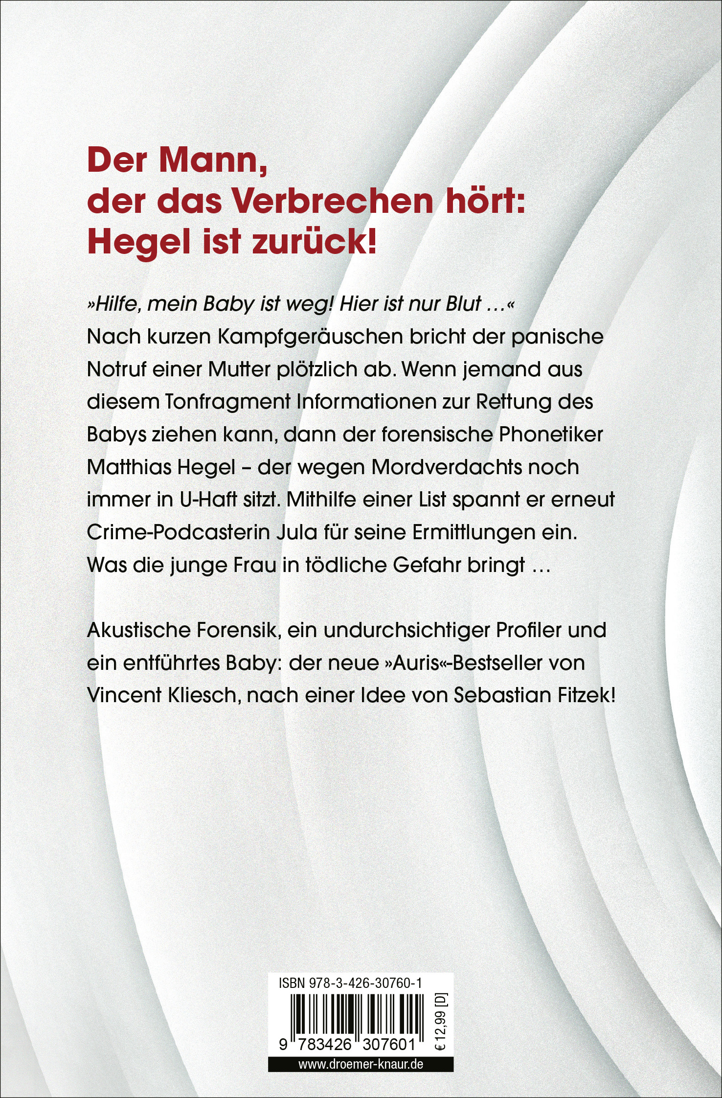 Akustische Forensik, ein undurchsichtiger Profiler und ein entführtes Baby: die rasante Fortsetzung des Nr.-1-Spiegel-Bestsellers »Auris« der Thriller-Autoren Vincent Kliesch und Sebastian Fitzek! Auch im zweiten Teil der Thriller-Reihe ziehen die Bestseller-Autoren Vincent Kliesch und Sebastian Fitzek wieder alle Register: Nichts ist, wie es auf den ersten Blick scheint, und niemand bleibt so unschuldig, wie er es gern wäre. Rasante Spannung für die Fans außergewöhnlicher Thriller mit mehr als einer unerwarteten Wendung!