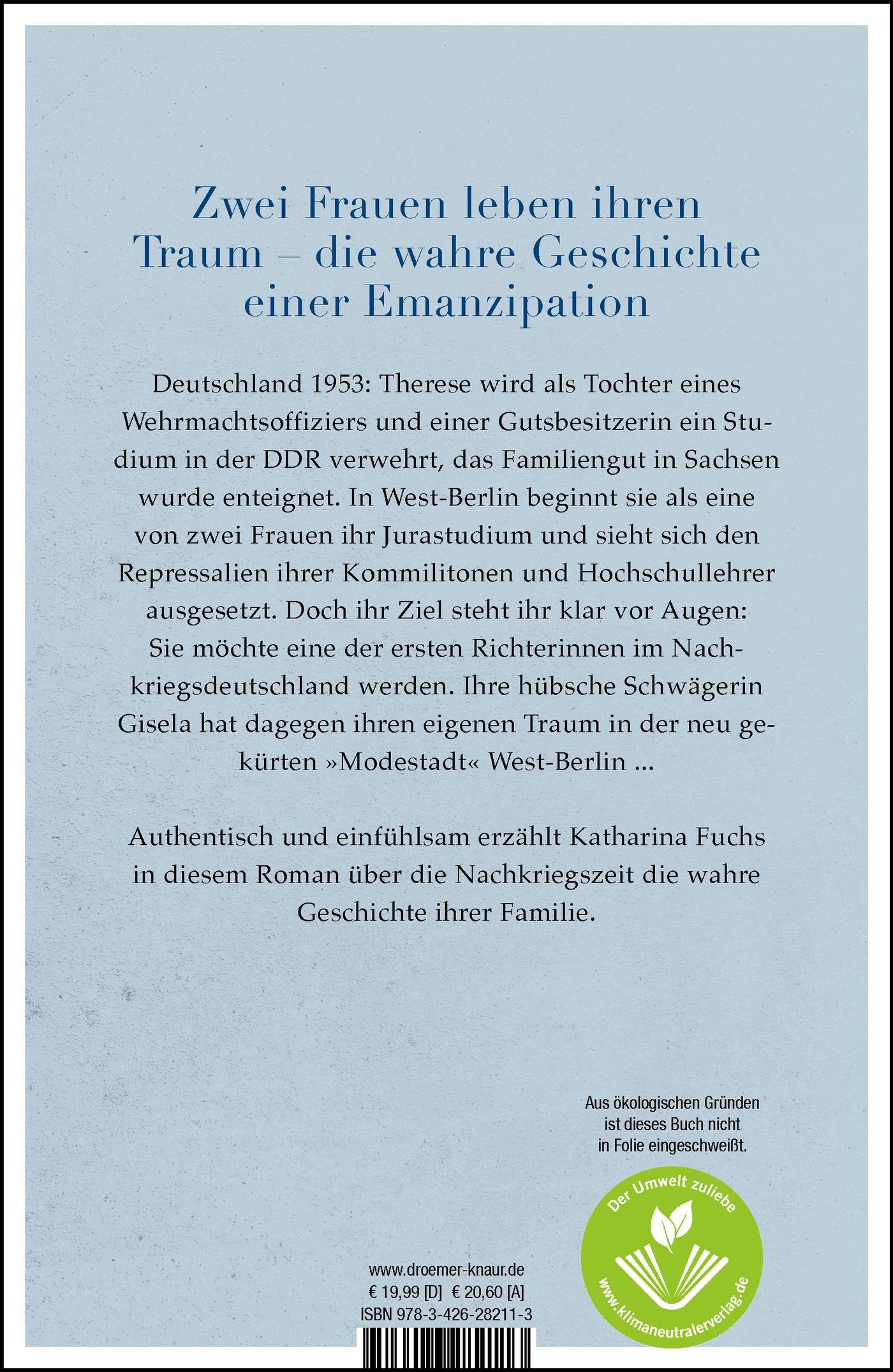 Zwei Frauen leben ihren Traum – gegen alle Widerstände der 50er und 60er Jahre Authentisch und einfühlsam erzählt Katharina Fuchs in diesem Roman über die Nachkriegszeit die wahre Geschichte ihrer Tante, die eine der allerersten Vorsitzenden Richterinnen Deutschlands war und ihrer Mutter, einer Modemacherin. Basierend auf ihrer eigenen Familiengeschichte hat Katharina Fuchs Leben und Träume der Frauen in den 50er Jahren eingefangen und zu einem großen Roman über die Nachkriegszeit verarbeitet. Mit viel Liebe zum Detail lässt sie Zeitgeschichte und zwei berührende Frauen-Schicksale lebendig werden.