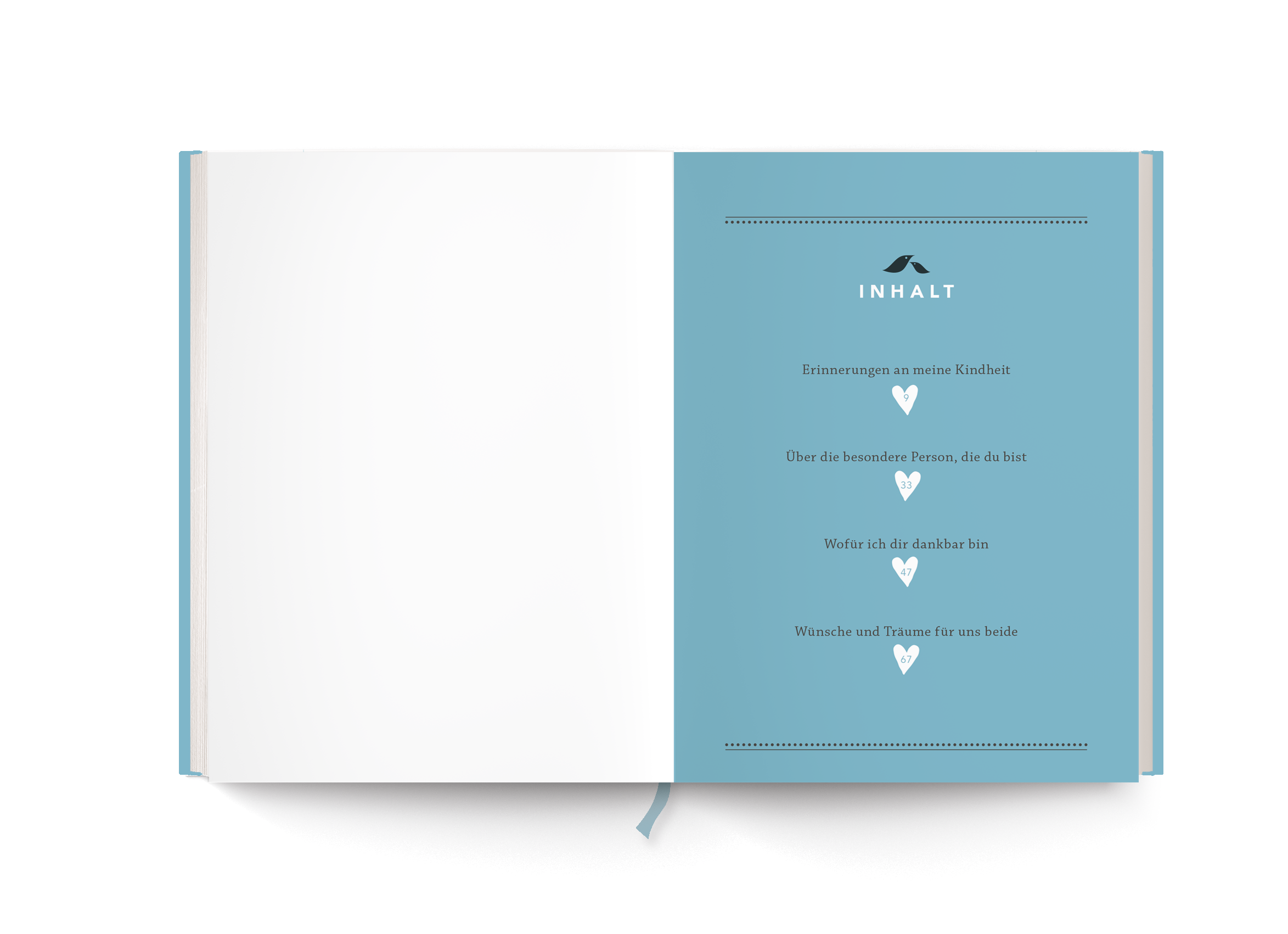 - Aufgeteilt in vier Themenblöcke: 1. Erinnerungen an meine Kindheit, 2. Über die besondere Person, die du bist, 3. Wofür ich dir dankbar bin, 4. Wünsche und Träume für uns beide