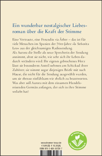 Schlagworte 70er Jahre des 20. Jahrhundert • Aurora • Barcelona • Francos Tod • Hörfunk • Kummerkasten • Liebe • Liebesgeschichte • Liebesroman • Nostalgie • Radio • Radiomoderatorin • Radiosendung • Romane für Frauen • Romane Liebe • Romane Spanien • Romantische Liebe • Romantische Liebesromane • Senorita Leo • Spanien • Stimme • verletzte Persönlichkeit