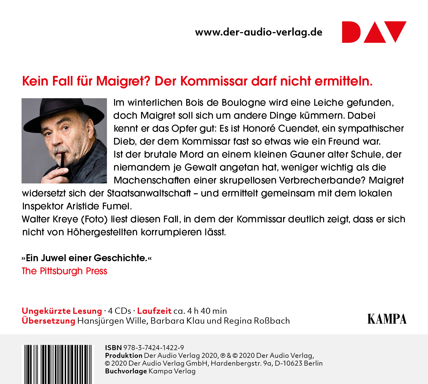 »Es ist schön, wie der Schauspieler Walter Kreye die Geschichte herausarbeitet, unpathetisch, präzise und warm, in der Sprechhaltung auch in diesem eher altmodischen Ambiente klar und modern.« WDR 3 »Walter Kreye beweist sich wieder als vollkommen überzeugender Interpret der Maigret-Romane: ruhig und höchst fokussiert nimmt er die Hörer mit in Maigrets Innerstes.« Bayerischer Rundfunk »Walter Kreye ist der neue Maigret. Er macht ihn sich mit ruhiger, tiefer Stimme, die viel Wärme verströmt, zu eigen. Der behäbige Pariser Kommissar und versierte Menschenkenner nimmt so Gestalt an.« Süddeutsche Zeitung »Die Edition ist ein Paukenschlag. DAV wird damit für Aufsehen sorgen.« hr2-kultur