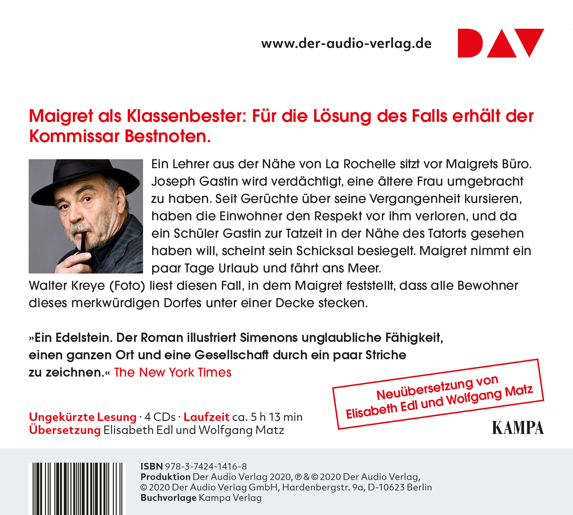 Walter Kreye, geboren 1942, spielte an Bühnen wie dem Hamburger Schauspielhaus, dem Thalia Theater, dem Staatstheater Stuttgart sowie an der Schaubühne Berlin. Der mit dem Grimme-Preis ausgezeichnete Schauspieler wurde durch zahlreiche Film- und Fernsehrollen bekannt, u. a. als Hauptkommissar Kress in »Der Alte« und durch die Netflix-Serie »Dark«. Der beliebte Hörbuchsprecher liest alle Fälle von Kommissar Maigret in der Edition Simenon ein.