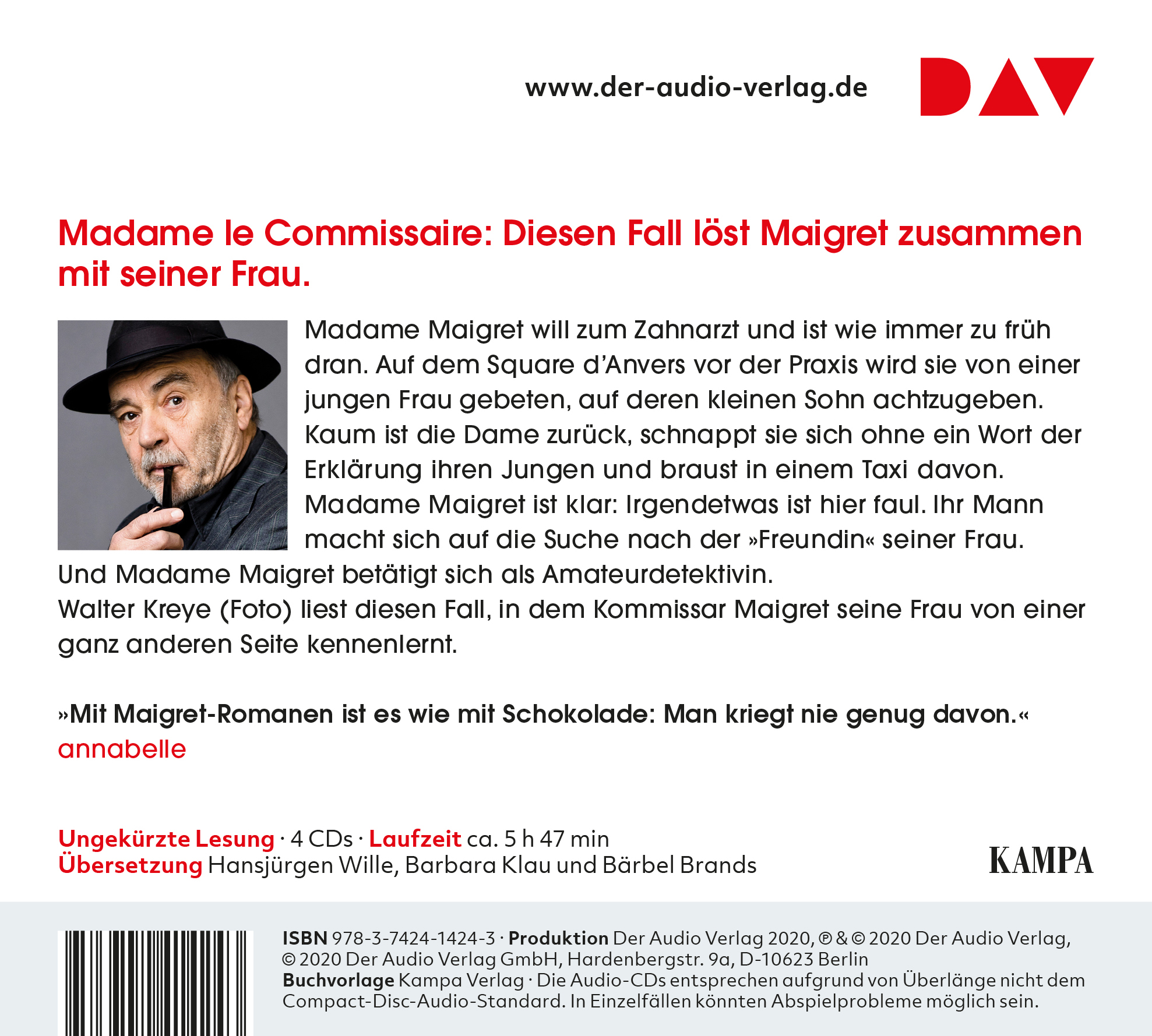 »Es ist schön, wie der Schauspieler Walter Kreye die Geschichte herausarbeitet, unpathetisch, präzise und warm, in der Sprechhaltung auch in diesem eher altmodischen Ambiente klar und modern.« WDR 3 »Walter Kreye beweist sich wieder als vollkommen überzeugender Interpret der Maigret-Romane: ruhig und höchst fokussiert nimmt er die Hörer mit in Maigrets Innerstes.« Bayerischer Rundfunk »Walter Kreye ist der neue Maigret. Er macht ihn sich mit ruhiger, tiefer Stimme, die viel Wärme verströmt, zu eigen. Der behäbige Pariser Kommissar und versierte Menschenkenner nimmt so Gestalt an.« Süddeutsche Zeitung »Die Edition ist ein Paukenschlag. DAV wird damit für Aufsehen sorgen.« hr2-kultur