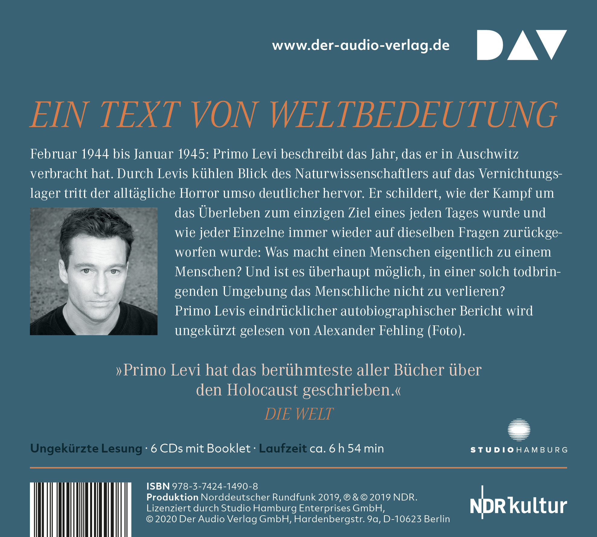 Ein Text von Weltbedeutung erstmals als Hörbuch! Der erste Bericht eines Auschwitz-Überlebenden aus dem Jahr 1947. Ursendung auf NDR Kultur ab 13. Januar 2020.