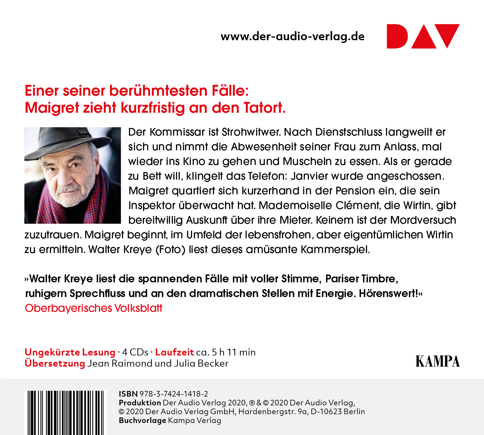Walter Kreye, geboren 1942, spielte an Bühnen wie dem Hamburger Schauspielhaus, dem Thalia Theater, dem Staatstheater Stuttgart sowie an der Schaubühne Berlin. Der mit dem Grimme-Preis ausgezeichnete Schauspieler wurde durch zahlreiche Film- und Fernsehrollen bekannt, u. a. als Hauptkommissar Kress in »Der Alte« und durch die Netflix-Serie »Dark«. Der beliebte Hörbuchsprecher liest alle Fälle von Kommissar Maigret in der Edition Simenon ein.