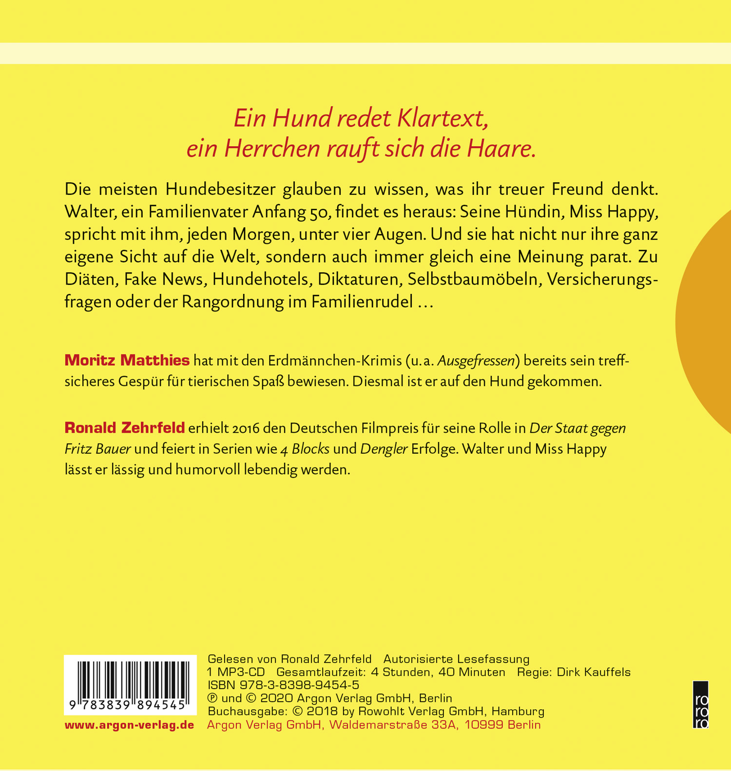 | Schlagworte | Berlin • Erdmännchen • Familie • Hans Rath • Haustier • Herrchen • Hund • Hundefreundschaft • Känguru-Prinzip • Labrador • Moritz Matthies • Philosophie • Weisheit |
