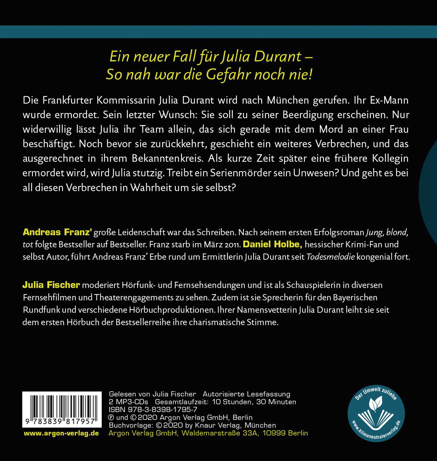 Ein neuer Fall für Julia Durant – So nah war die Gefahr noch nie! Julia Fischer arbeitet als Sprecherin für Rundfunk und Fernsehen und leiht Julia Durant seit dem ersten Hörbuch der Bestsellerreihe ihre charismatische Stimme.