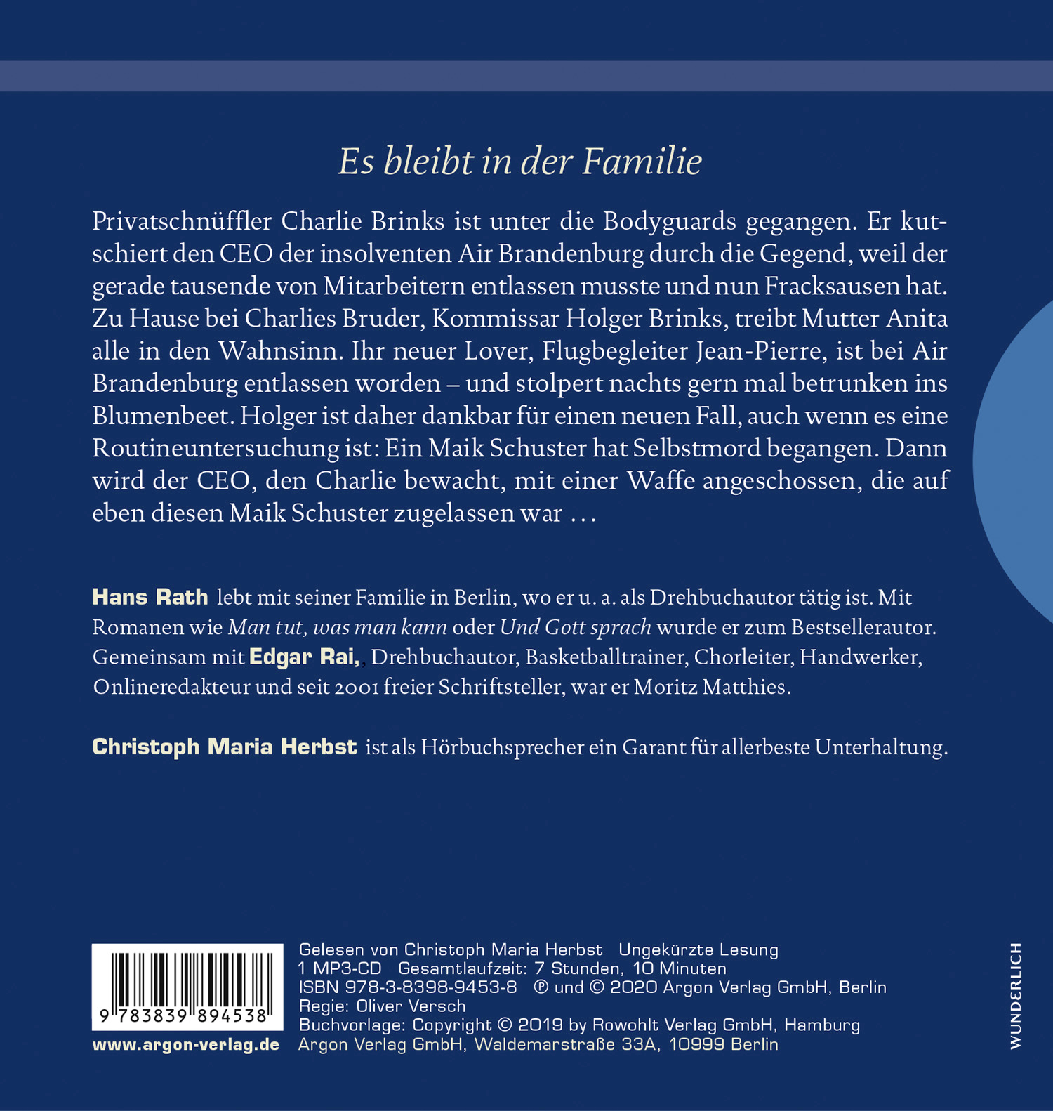 Man mag es kaum glauben: Charlie hat einen Job. Die Fluglinie Air Brandenburg musste Insolvenz anmelden und jetzt haben die vier Aufsichtsräte Fracksausen, weil jeder von ihnen Millionen kassiert, während die Belegschaft auf der Straße sitzt. Also wollen sie Personenschützer. Und so kutschiert Charlie neuerdings Dr. Dr. Hundt in einem fetten Mercedes durch die Gegend. Das mit dem Job war höchste Zeit, denn zu Hause bei Holger wird die Luft dicker und dicker. Wegen Mutter Anita. Sie strapaziert die Nerven aller Beteiligten gehörig. So ist Holger insgeheim ganz dankbar, als ihm ein neuer Fall auf den Tisch flattert. Und bald ist klar: Die Brüder haben wieder gemeinsam etwas zu klären, ob sie wollen oder nicht.