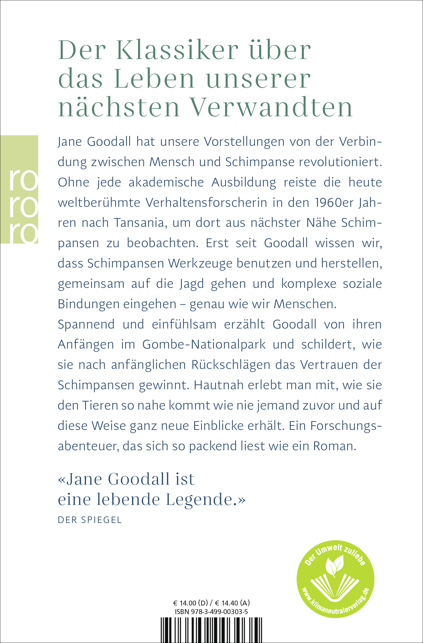 Jane Goodall wurde am 3. April 1934 in England geboren. 1957 reiste sie zum ersten Mal nach Afrika und begann ab 1960, das Verhalten wildlebender Schimpansen im Gombe-Nationalpark in Tansania zu untersuchen. 1965 promovierte sie an der Universität in Cambridge zum Thema Verhaltensbiologie. Für ihre bahnbrechenden Erkenntnisse über das Leben der Schimpansen erhielt sie viele Preise und Orden, wurde 2004 von der Queen geadelt und ist UN-Friedensbotschafterin. Sie ist Gründerin des Jane Goodall Institute, einer internationalen Tier- und Umweltschutzorganisation, und begeistert mit dem "Roots & Shoots"-Programm auch Kinder und Jugendliche für ein ökologisches Engagement. Ihre Bücher über Verhaltensforschung und und ihre Kinderbücher wurden in zahlreiche Sprachen übersetzt. Wenn sie nicht auf Vortragsreisen ist, lebt Jane Goodall heute im englischen Bournemouth.