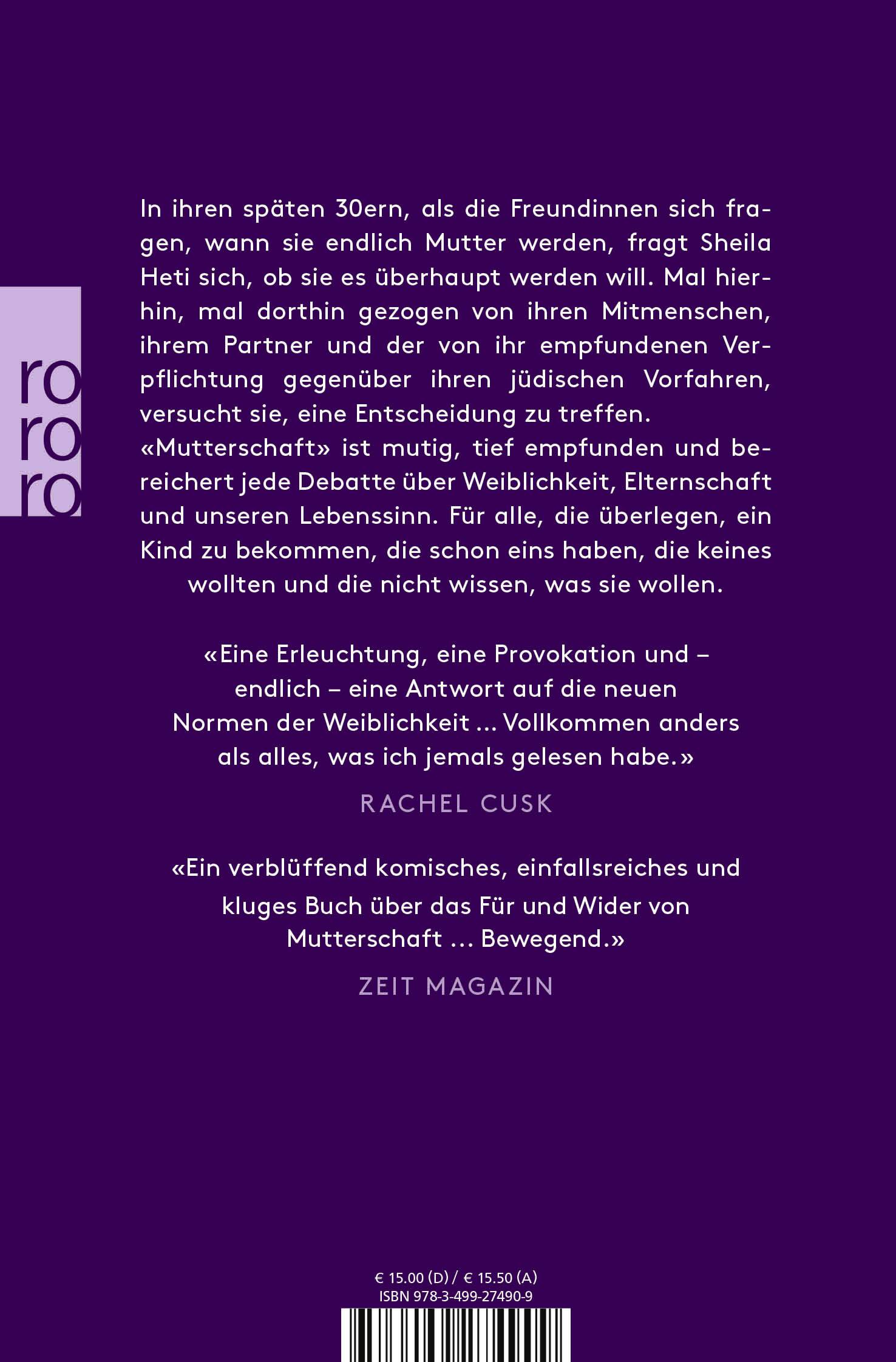 Vielleicht ist das die größte Stärke von "Mutterschaft": dass am Ende keine Lebensform als die bessere gilt ... ein verblüffend komisches, einfallsreiches und kluges Buch über das Für und Wider von Mutterschaft ... bewegend. Ilka Piepgras ZEITmagazin 20181108