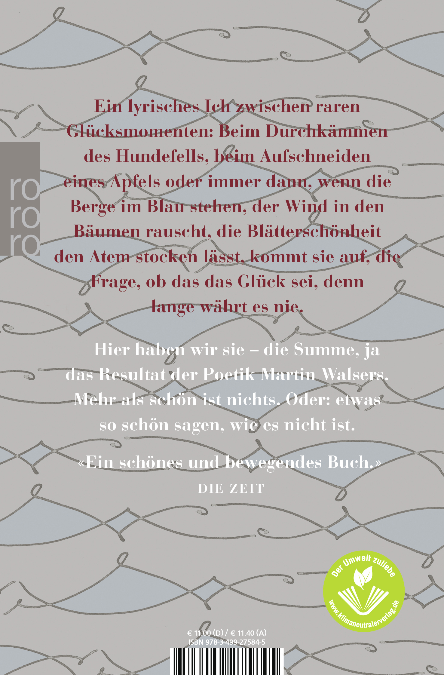 «Das Alter ist ein Zwergenstaat, regiert von jungen Riesen.» Wer sagt das? Ein lyrisches Ich zwischen Glücksmomenten und Schwärze, Leere, Sturz. Beim Durchkämmen des Hundefells, beim Aufschneiden eines Apfels oder immer dann, wenn die Berge im Blau stehen, der Wind in den Bäumen rauscht, die Blätterschönheit den Atem raubt, kommt sie auf, die Frage, ob das das Glück sei, denn lange währt es nie. Schon fährt etwas dazwischen, Wörter, die wehtun, ausgesprochen von anderen, gegen die nur eines hilft: «Sich in Verse hüllen, als wären es Schutzgewänder, schön, weltabweisend, die Einbildung heißt Aufenthalt.» In Martin Walsers neuem Buch finden sich Lebensstenogramme, mal sind sie lyrisch, mal essayistisch, immer aber berührend, tief empfunden, wahr.