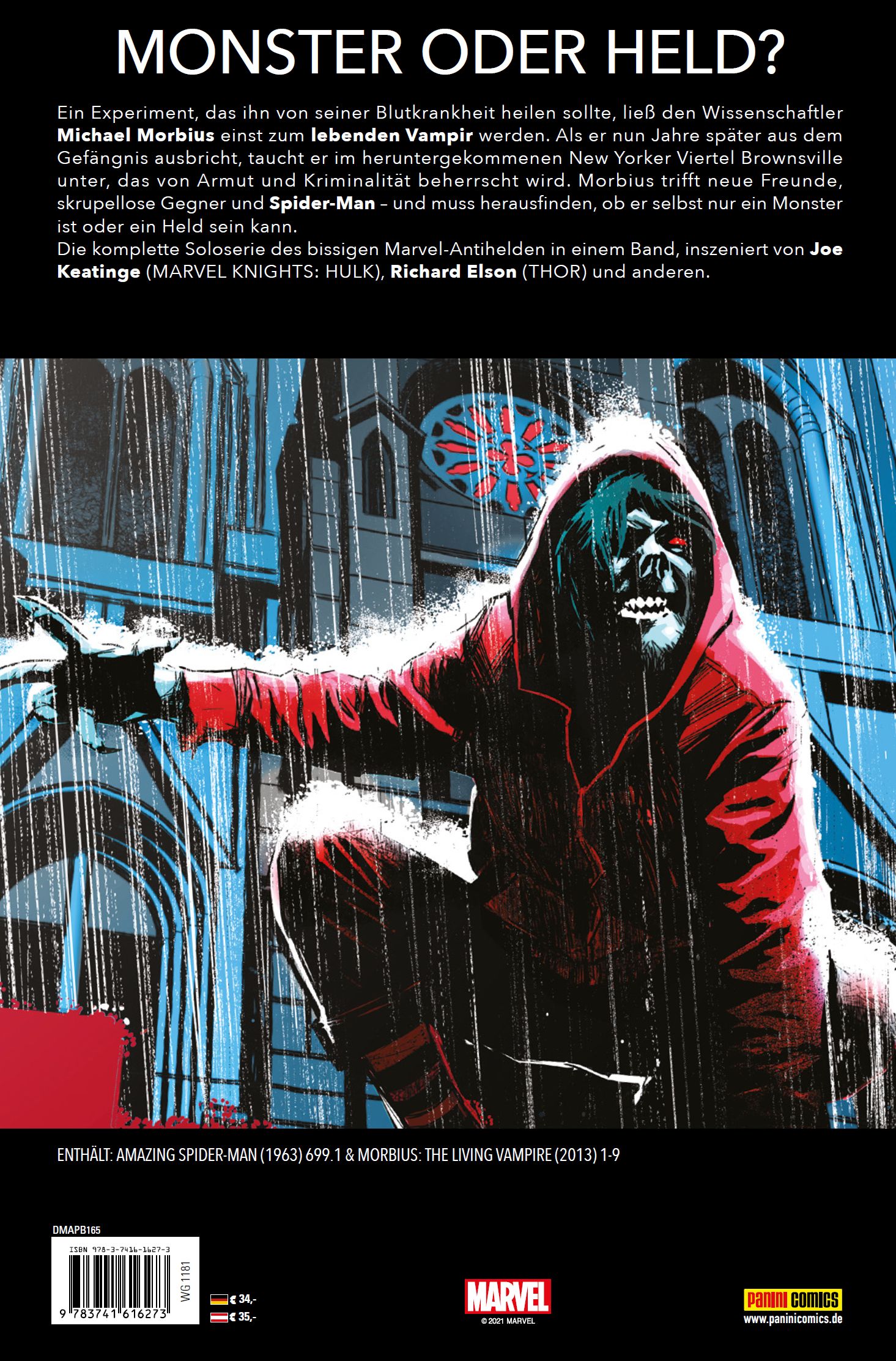 EINLEITUNG von Christian EndresDer lebende Vampir Morbius wurde 1971 von Autor Roy Thomas und Zeichner Gil Kane - zwei echten Marvel-Legenden - für das Heft Amazing Spider-Man 101 erschaffen. Über die Jahre entwickelte sich der griechische Wissenschaftler Dr. Michael Morbius, dessen tragische Herkunftsgeschichte auf den folgenden Seiten neu interpretiert wird, von einem blutsaugenden Schurken zu einem vampirischen Antihelden. Als Teil der Midnight Sons oder der Legion of Monsters kämpfte Spider-Mans früherer Widersacher nicht nur in der unterirdischen Stadt Monster Metropolis für das Gute - in der Reihe MARVEL ZOMBIES stellte er sich sogar einer Zombie-Invasion aus einer anderen Realität, die immerhin von The Walking Dead-Schöpfer Robert Kirkman angezettelt worden war. In diesem Sammelband präsentieren wir pünktlich zum ersten Film über Marvels lebenden Vampir mit Jared Leto in der Hauptrolle die komplette Comic-Serie des düsteren Antihelden aus Spider-Mans Welt, die Autor Joe Keatinge, Zeichner Richard Elson und ihre Mitstreiter 2013 inszenierten. Morbius' Abenteuer von Keatinge und Co. begannen in einer Sondernummer von Spideys Traditionsserie Amazing Spider-Man.Nicht lange davor hatte Dr. Morbius im Geheimen in den Horizon Labs seines Freundes Max Modell geforscht. Michael wollte sich und Lizard Dr. Curt Connors von ihren bestialischen Anwandlungen befreien, doch die Dinge gerieten außer Kontrolle: Der Vampir verlor wegen Connors, der Blut ins Horizon-Lüftungssystem gab, die Beherrschung über seinen Blutdurst, griff Menschen an und wurde im Kampf vom Netzschwinger besiegt. So landete Morbius im Raft-Hochsicherheitsgefängnis auf einer Insel vor Manhattan, wo damals auch Dr. Octopus alias Otto Octavius einsaß. In der ersten Story, die diesen Band eröffnet, wusste zum Zeitpunkt des originalen Erscheinens noch niemand, dass es Doc Ock da bereits gelungen war, seinen Geist in den Körper von Spider-Man zu transferieren, während Petes Verstand im Leib des dahinsiechenden Superbösewichts gefangen war. Dr. Octopus, der mithilfe von Trapster und Hydro-Man aus dem Raft ausbrach, war also in Wahrheit Spidey! In der Jubiläumsausgabe Amazing Spider-Man 700 von Dan Slott und Humberto Ramos starb Pete dann scheinbar in Ocks Körper, und Octavius machte als Peter Parker und Spider-Man weiter, der ruchlos gegen Schurken vorging und dabei Gadgets wie seine Spider-Bots einsetzte. Die Ära Marvel NOW! begann also mit Dr. Octopus als arrogantem, überlegenem Spider-Man - und mit einem Comic-Solo für Morbius ...