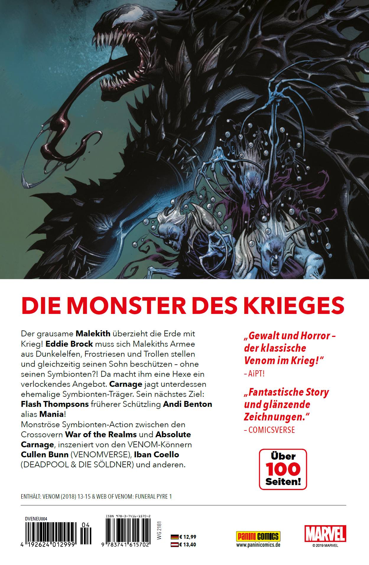 VORWORT von Christian EndresNach Spider-Man verband sich Eddie Brock mit dem Symbionten aus dem außerirdischen Volk der Klyntar, der ihn zu Venom machte. Ein Abkömmling des Aliens verschmolz außerdem mit Brocks einstigem Zellennachbarn, dem wahnsinnigen Serienkiller Cletus Kasady, zum blutrünstigen, tödlichen Carnage. Eine Zeit lang agierte auch Flash Thompson als Wirt des Klyntar. Unter dem Decknamen Agent Venom bekämpfte er z. B. den Superschurken Jack O'Lantern und gab ein Stück seines Symbionten her, um seine Schülerin Andi Benton zu retten und in die Symbionten-Trägerin Mania zu verwandeln. Allerdings raubte ihr Lee Price kürzlich den Klyntar, weshalb Andi jetzt nur noch die höllische, dämonenbeschwörende Macht des Höllenmals hat, das sie obendrein trägt. Vor nicht allzu langer Zeit starb Flash und Eddie wurde wieder mit dem Klyntar vereint.In seiner alten Heimat San Francisco erfuhr Eddie, dass der Symbiont mit seinen Erinnerungen herumpfuschte und er einen neunjährigen Sohn namens Dylan hat. Nach der abermaligen Trennung von seiner Alien-Hälfte kommen Eddie und Dylan nun nach New York - wo der Dunkelelf Malekith im Crossover War of the Realms eine Invasion der Erde startete! Durch ein Portal kommen Frostriesen, Dunkelelfen und der Rest seiner Armee nach New York, um die Welt der Menschen in die Knie zu zwingen, nachdem Asgard und Co. bereits gefallen sind. Aber auch das nächste Marvel-Event Absolute Carnage wirft seinen Schatten voraus. Im letzten Band der VENOM-Serie brachte ein Kult Cletus Kasady von den Toten zurück. Sie injizierten Kasady die Reste des Symbionten von Knull, dem finsteren Gott vom Planeten der Klyntar. Der Kult fand außerdem heraus, dass jeder Symbiont genetisch ein Stück von sich in seinem Wirt zurücklässt, und so jeder ein Stück Knull in sich trägt - den sogenannten Codex. Wenn der wiedergeborene Carnage jeden Codex früherer Symbionten-Träger verschlingt, kann er die Macht von Knull erlangen. Und so beginnt Carnages Jagd auf frühere Wirte fast zeitgleich mit Malekiths Invasion der Erde ...
