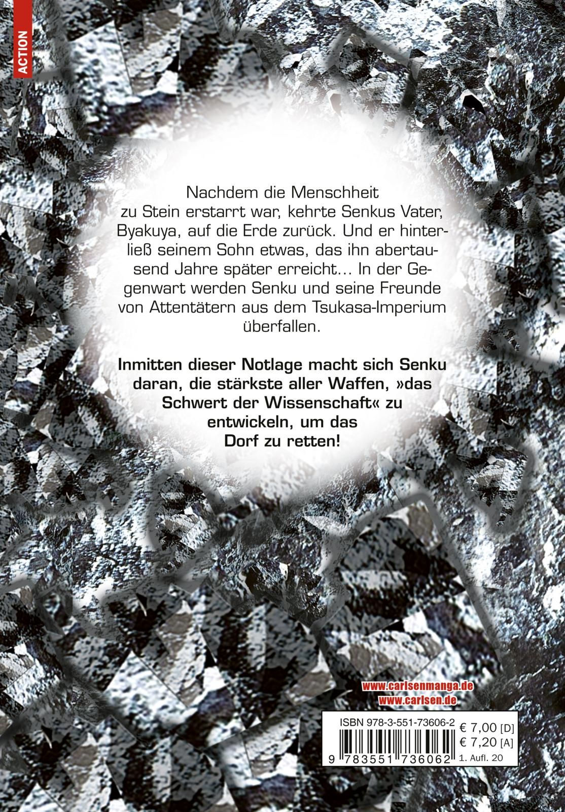 Nachdem die Menschheit zu Stein erstarrt war, kehrte Senkus Vater, Byakuya, auf die Erde zurück. Und er hinterließ seinem Sohn etwas, das ihn abertausend Jahre später erreicht... In der Gegenwart werden Senku und seine Freunde von Attentätern aus dem Tsukasa-Imperium überfallen. Inmitten dieser Notlage macht sich Senku daran, die stärkste aller Waffen, »das Schwert der Wissenschaft« zu entwickeln, um das Dorf zu retten!