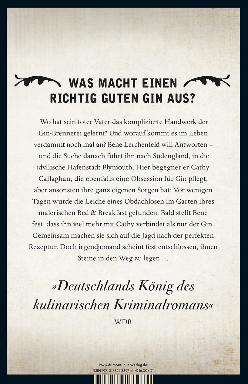 Der Gin schmeckt besser als alles, was Bene je getrunken hat. Er beschließt, das verlorene Rezept dieses ganz besonderen Tropfens ausfindig zu machen. Eine Suche auf den Spuren seines Vaters, die ihn nach Plymouth führen wird – wo Cathy und der tote Obdachlose auf ihn warten …