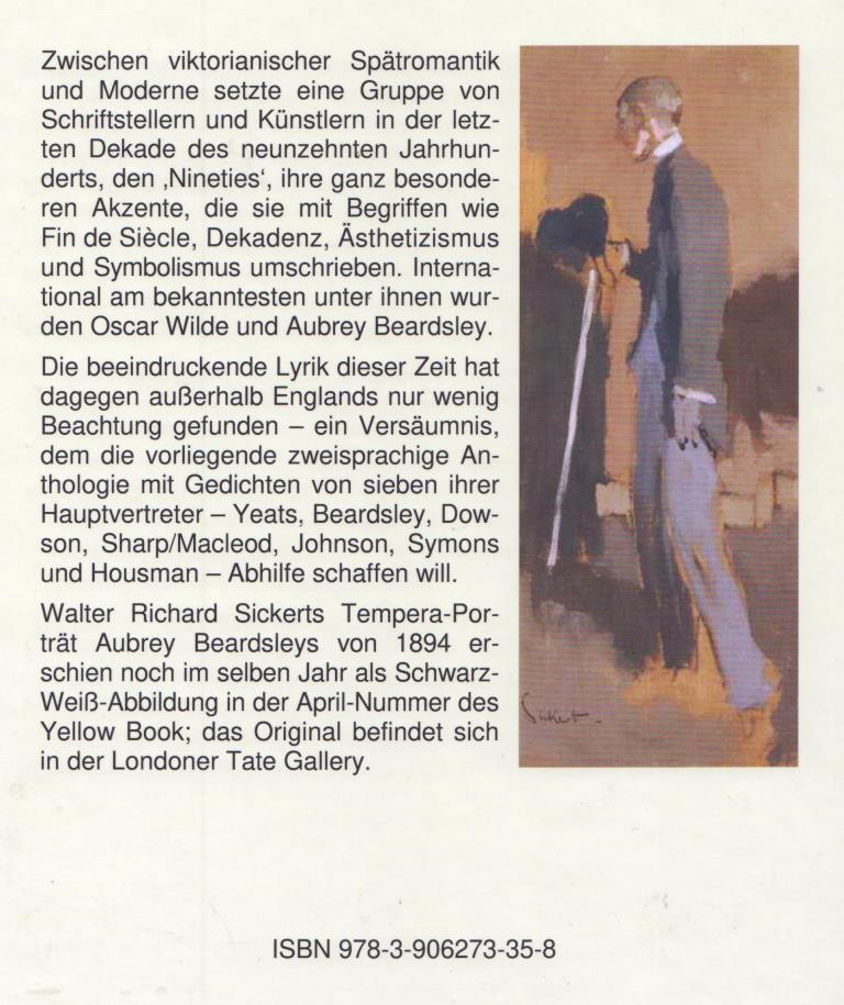 Die vorliegende Anthologie enthält – englisch und deutsch – Gedichte von YEATS / BEARDSLEY / DOWSON / SHARP-MCLEOD / JOHNSON / SYMONS / HOUSMAN.