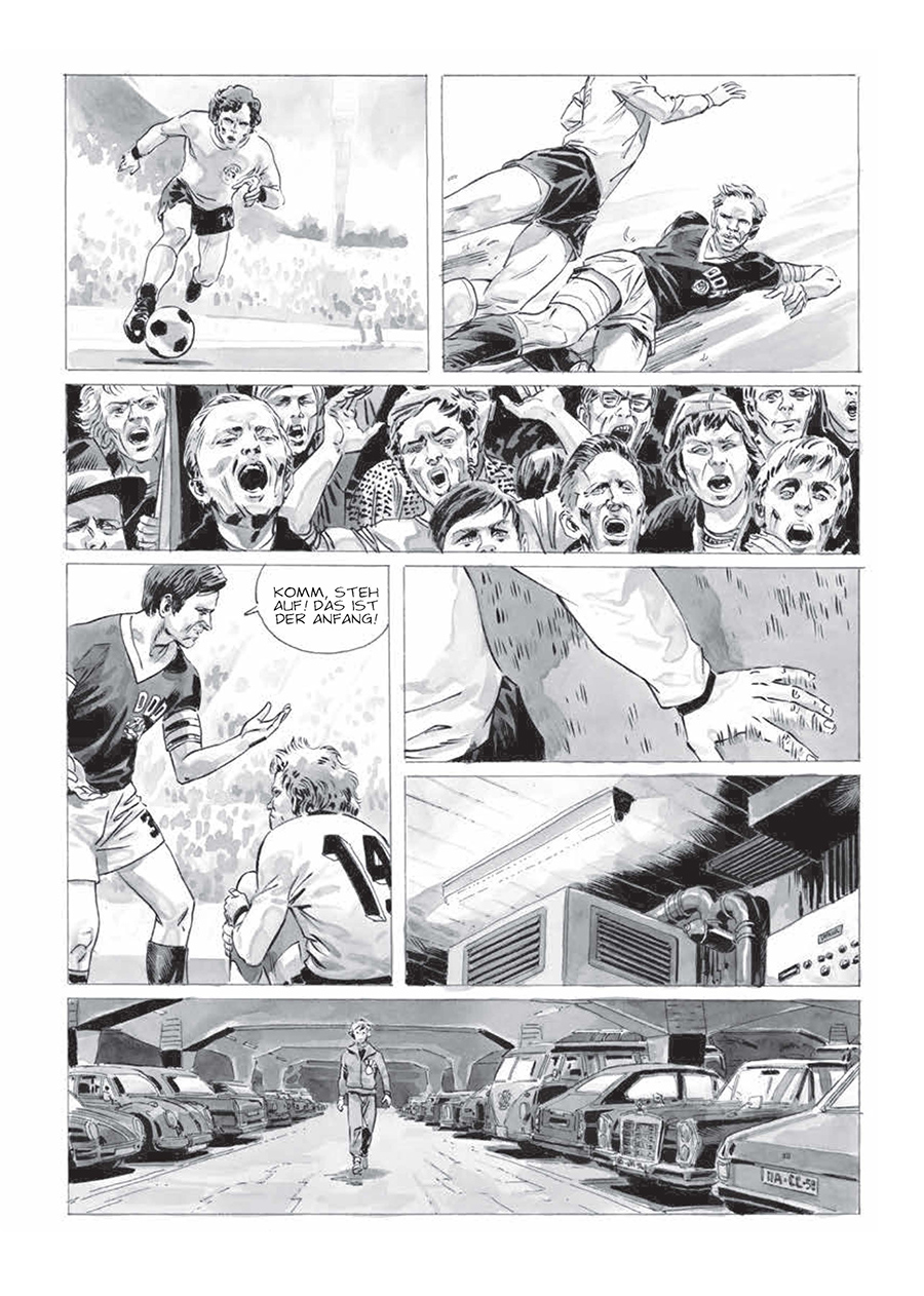 Juni 1974: ganz Deutschland ist im Fußballfieber. Ganz Deutschland? Oh ja, Ost wie West. Denn nicht nur, dass die Fußballweltmeisterschaft in diesem Jahr in der Bundesrepublik stattfindet, auch die DDR ist erstmals bei einer WM vertreten. Und dann treffen sie auch noch in derselben Gruppe aufeinander. Im letzten Vorrundenspiel kommt es so zum historischen Bruderduell BRD-DDR. Das erste deutsch-deutsche Länderspiel. Und wie sich viel später zeigen wird, zugleich das letzte. Im Schatten dieser Begegnung kommt es auch zum Wiedersehen zweier Brüder, dem ersten seit zwölf Jahren. Offiziell vertritt jeder von ihnen einen der deutschen Staaten. In Wahrheit stehen sie auf derselben Seite. Der eine ist als Geheimagent im Westen tätig, der andere im Osten geblieben und auch dort für die Stasi aktiv. Allerdings ist er im Laufe der Jahre nachdenklich geworden, was seine Rolle und seine Perspektiven betrifft. Es herrscht Redebedarf, und am Ende beschließen die Brüder zu handeln. Mit dramatischen Folgen.Nach »Die Reise des Marcel Grob« nähern sich Philippe Collin (Szenario) und Sébastien Goethals (Zeichnung) erneut einem zentralen Kapitel der deutschen Geschichte auf erfrischend unorthodoxe Weise an: »Das Spiel der Brüder Werner« ist ein fiktives, aber auf wahren Begebenheiten beruhendes, packendes Familiendrama vor dem Hintergrund des legendären Fußballduells BRD-DDR. Ein umfassender historischer Anhang ergänzt die Graphic Novel.