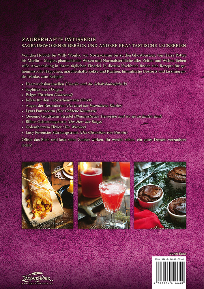| Schlagworte | Alice im Wunderland • Aurélia Beaupommier • Baba Jaga • Backbuch • Backen • Charlie und die Schokoladenfarbrik • Charmed • Cocktails • Der Herr der Ringe • Dungeons & Dragons • Eragon • fantas • Film • Final Fantasy • Fluch der Karibik • Food • Frankreich • ghostbusters • Gremlins • Harry Potter • Hexer • Hobbit • Kekse • Kochbuch • Kochen • Kuchen • Märchen • Mittelerde • Nachtisch • Narnia • Peter Pan • Serie • Shrek • Torte • Twilight • Vegetarisch • Veggie • Witcher • Zauberhafte Küche |