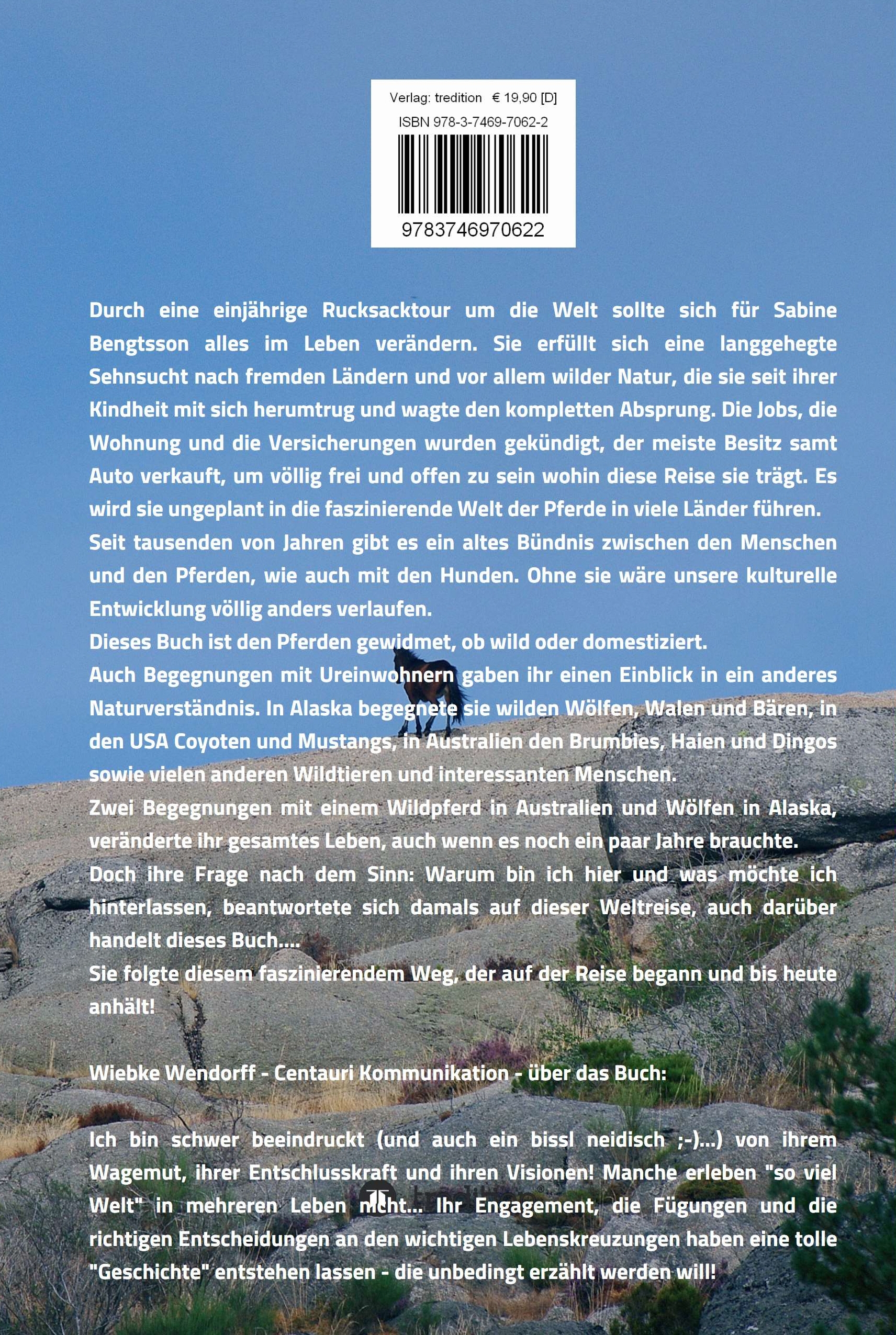 Sabine Bengtsson wurde in Hamburg geboren und wuchs ländlich mit einer Schwester in Schleswig-Holstein auf. Tiere und die Natur waren von klein auf an Teil ihres Lebens. Sie ist ein absoluter Naturmensch und mit dem Fernwehvirus infiziert. Respekt und Faszination für alles, was lebt, hat ihr ihre Familie mitgegeben. Sie hatte seit ihrer Kindheit den Traum, um die Welt zu reisen. 1997 wurde es Wirklichkeit: Hab und Gut verkauft, die Wohnung und den Job gekündigt, um mit dem Rucksack ein Jahr außerhalb Europas unterwegs zu sein. Sie hat dieses Jahr draußen in der Natur verbracht und hatte unglaublich faszinierende Begegnungen mit Ureinwohnern, der Natur und wilden Tieren. Es ergab sich eher zufällig, dass immer wieder (Wild) Pferde auf dieser Reise ihren Weg kreuzten. Sie hatte auf dieser Reise noch das seltene Glück den Urvater des Horsemanship Tom Dorrance zu erleben, Wildpferde in verschiedenen Kontinenten zu beobachten, berühmte und weniger berühmte, außergewöhnliche Pferdetrainer, Reitausbilder, Sattler, Züchter, (Wild)-Pferdeorganisationen und viele mehr zu treffen… In Alaska begegnete sie wilden Wölfen und Bären, in den USA Coyoten und Mustangs, in Australien den Brumbies und Dingos und vielen anderen Wildtieren. Speziell eine Begegnung mit einem australischen Wildpferd und Wölfen in Alaska waren der Anstoß den facettenreichen Spuren der (Wild) Pferde und Wölfe weiter zu folgen. Für sie haben diese Tiere einen besonderen Stellenwert, da sie uns Menschen am längsten begleiten und untrennbar mit unserer kulturellen Entwicklung verbunden sind. Wie wir mit ihnen umgehen, zeigt auch unsere gesamte Einstellung zur Natur. Durch Begegnungen mit Ureinwohnern erhielt sie einen vielschichtigen Einblick in ein anderes Naturverständnis. In Europa folgte sie später ebenfalls den Spuren der europäischen Reitkultur. Sie hat mit den Gardians in der Camargue auf den Stierweiden gearbeitet, oder in Italien mit den Butteris die Trashumanz mit geritten. Über all dies hat sie dieses Buch geschrieben. Ihr Leben nahm dadurch auch eine neue Wendung und 2011 gründete sie Perlenfänger Naturtouren und Artenschutz, mit dem Fokus auf Wildpferde und Wölfe.