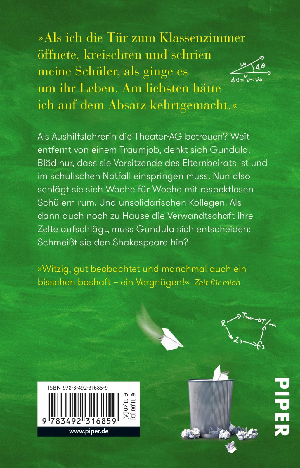 Nie wieder Schule! Das hat sich Gundula Bundschuh geschworen. Als aber Petra Federbein, nörgelnde Nachbarin und Direktorin am Gymnasium ihrer Kinder, voller Verzweiflung um Hilfe bittet, sagt Gundula widerwillig zu: Schon in der nächsten Woche soll sie als Lehrerin anfangen und einen Shakespeare für die 200-Jahr-Feier der Schule inszenieren.
