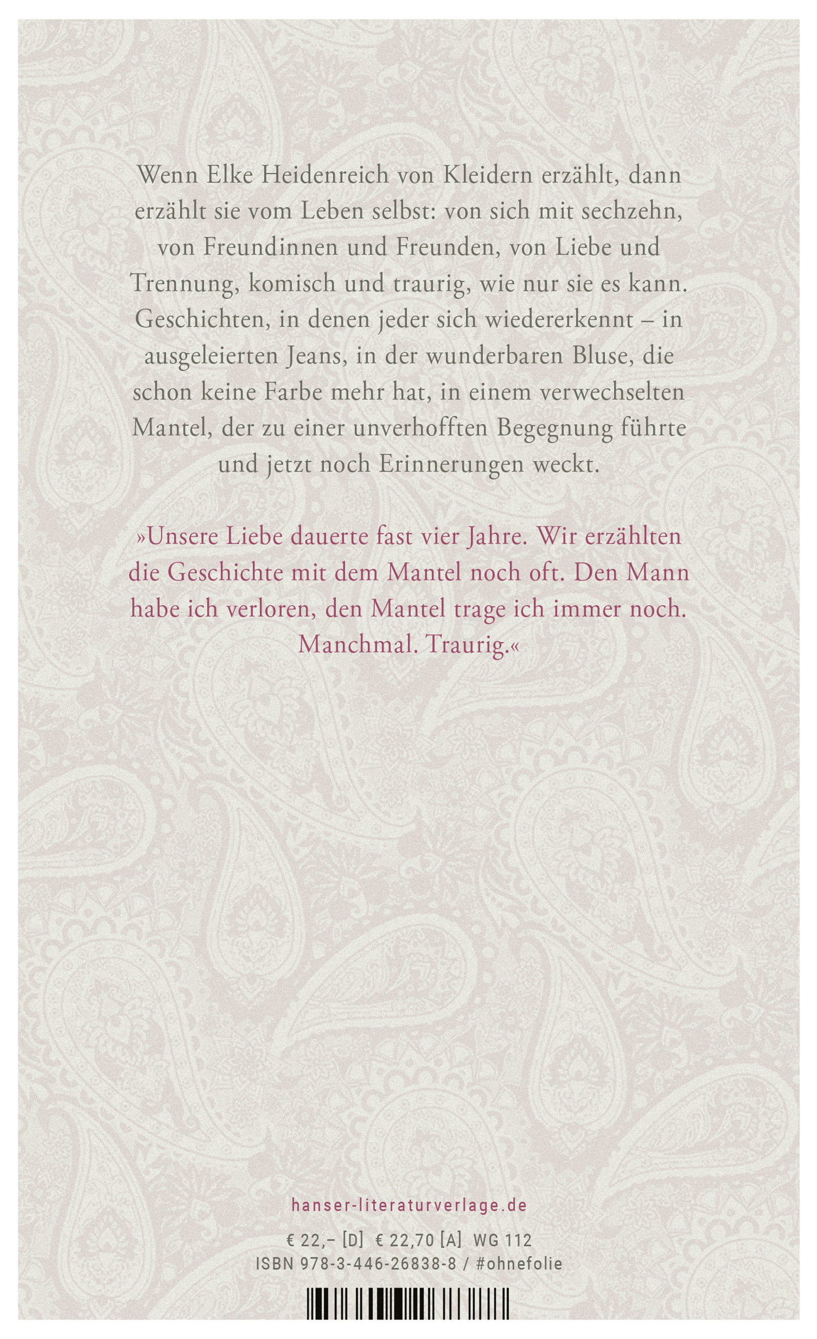 Wenn Elke Heidenreich von Kleidern erzählt, dann erzählt sie vom Leben selber: von sich mit sechzehn, von Freundinnen und Freunden, von Liebe und Trennung, erzählt Geschichten, komisch und traurig wie nur sie es kann, in denen jeder sich wiedererkennt: sei‘s in ausgeleierten Jeans, sei’s in der wunderbaren Bluse, die schon keine Farben mehr hat, oder schlimmstenfalls im Kamelhaarmantel.