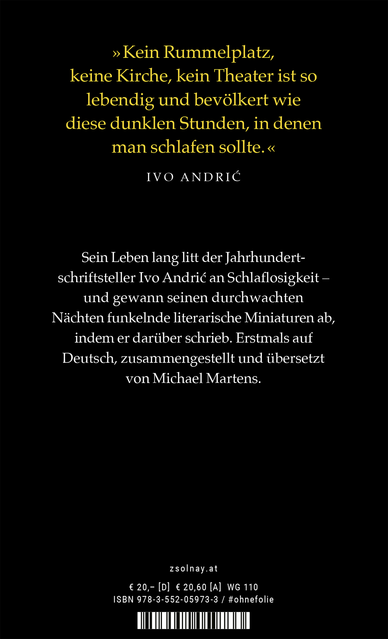 "Es ist unwahrscheinlich, dass Andrić der Veröffentlichung der Insomnia-Notate zugestimmt hätte: Viel zu intim! Umso schöner ist es, das wir die feinnervige aphoristische Prosa dieses Bandes nun dank der Vermittlungsleistung von Michael Martens lesen dürfen." Wolfgang Schneider, WDR 3, 29.01.21
