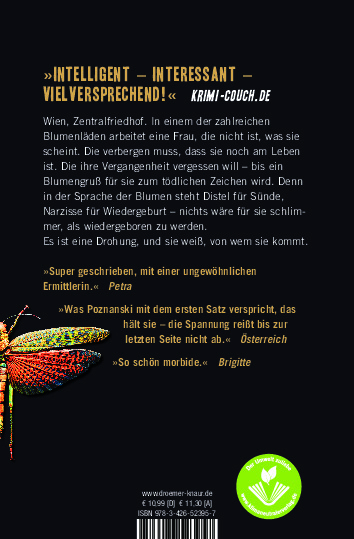 | Schlagworte | Baulöwen • Bestseller-Autorin • Blindenschrift • Blumenhandel • Blumenhändlerin • Blumen Symbolik • Erebos • Ermittlerin • Ermittler-Thriller • Floristin • Frankfurt • Fünf • geheimbotschaften • Geheime Botschaften • Geheimsprache • Kaspary • München • München-Thriller • neue Thriller Poznanski • Organisiertes Verbrechen • Polizeispitzel • Scharfschützin • Sprache der Blumen • Thalamus • Thriller Action • Thriller Autorinnen • thriller deutsch • Thriller deutsche Autoren • Thriller Deutschland • thriller österreich • thriller reihe • Thriller-Serie • undercover • Verbrecher-Syndikat • verdeckte Ermittlerin • Wien • Zentralfriedhof |