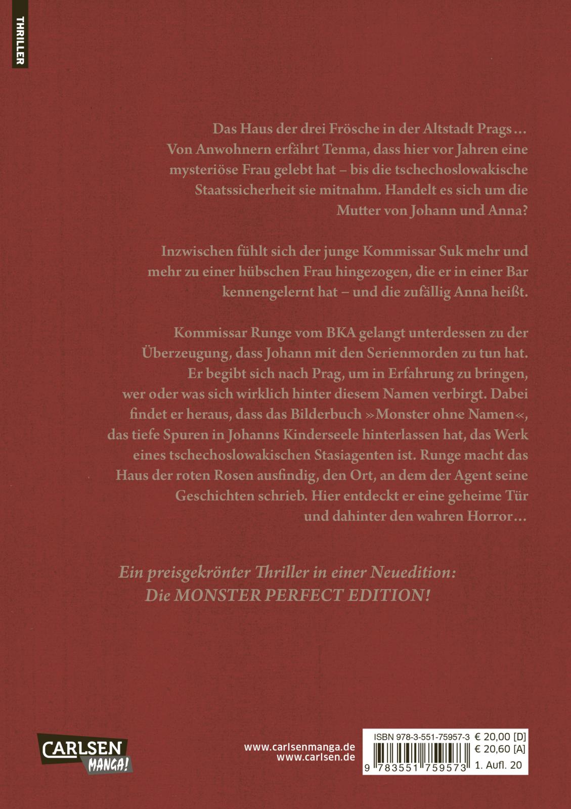 Tenma reist nach Prag, um die Vergangenheit von Johann genauer unter die Lupe zu nehmen. Er besucht das Haus der drei Frösche und erfährt von Anwohnern, dass hier vor Jahren eine mysteriöse Frau gelebt hat - bis die tschechoslowakische Staatssicherheit sie mitnahm. Handelt es sich um die Mutter von Johann und Anna?