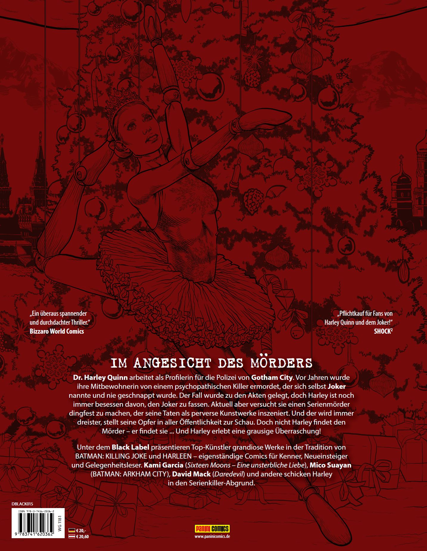 Unter dem Black Label präsentieren Top-Künstler grandiose Werke in der Tradition von BATMAN: KILLING JOKE und HARLEEN - eigenständige Comics für Kenner, Neueinsteiger und Gelegenheitsleser. Kami Garcia (Sixteen Moons - Eine unsterbliche Liebe), Mico Suayan (BATMAN: ARKHAM CITY), David Mack (Daredevil) und andere schicken Harley in den Serienkiller-Abgrund.