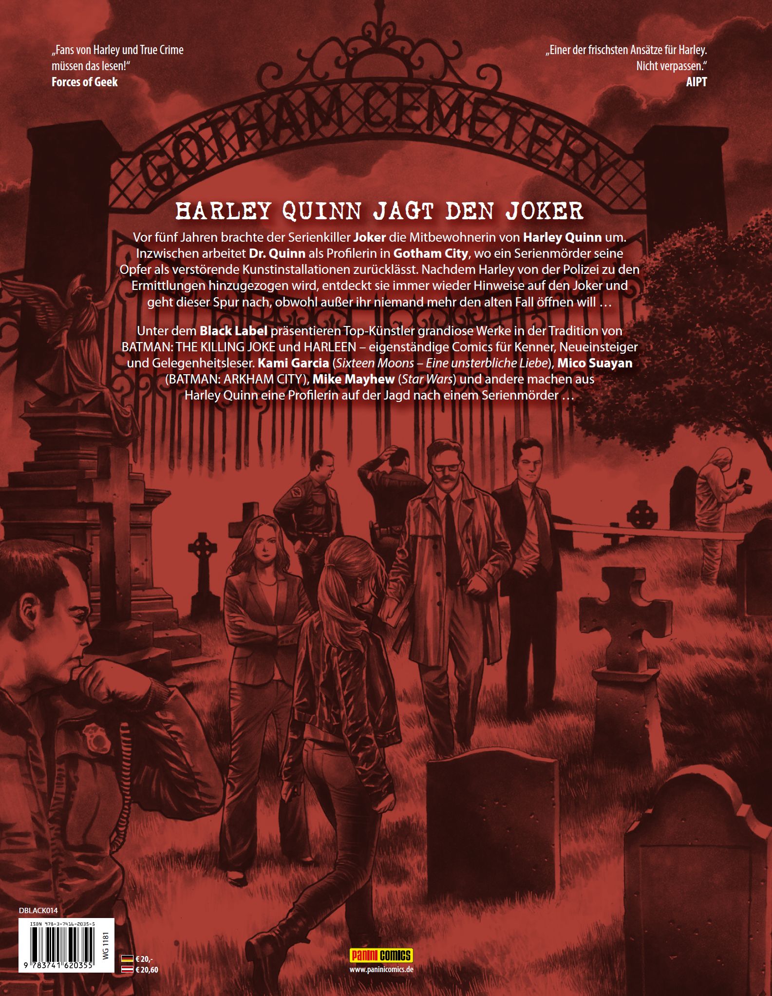 HARLEY QUINN JAGT DEN JOKERVor fünf Jahren brachte der Serienkiller Joker die Mitbewohnerin von Harley Quinn um. Inzwischen arbeitet Dr. Quinn als Profilerin in Gotham City, wo ein Serienmörder seine Opfer als verstörende Kunstinstallationen zurücklässt. Nachdem Harley von der Polizei zu den Ermittlungen hingezogen wird, entdeckt sie immer wieder Hinweise auf den Joker und geht dieser Spur nach, obwohl außer ihr niemand mehr den alten Fall öffnen will ...Unter dem Black Label präsentieren Top-Künstler grandiose Werke in der Tradition von BATMAN: THE KILLING JOKE und HARLEEN - eigenständige Comics für Kenner, Neueinsteiger und Gelegenheitsleser. Kami Garcia (Sixteen Moons - Eine unsterbliche Liebe), Mico Suayan (BATMAN: ARKHAM CITY), Mike Mayhew (Star Wars) und andere machen aus Harley Quinn eine Profilerin auf der Jagd nach einem Serienmörder ...