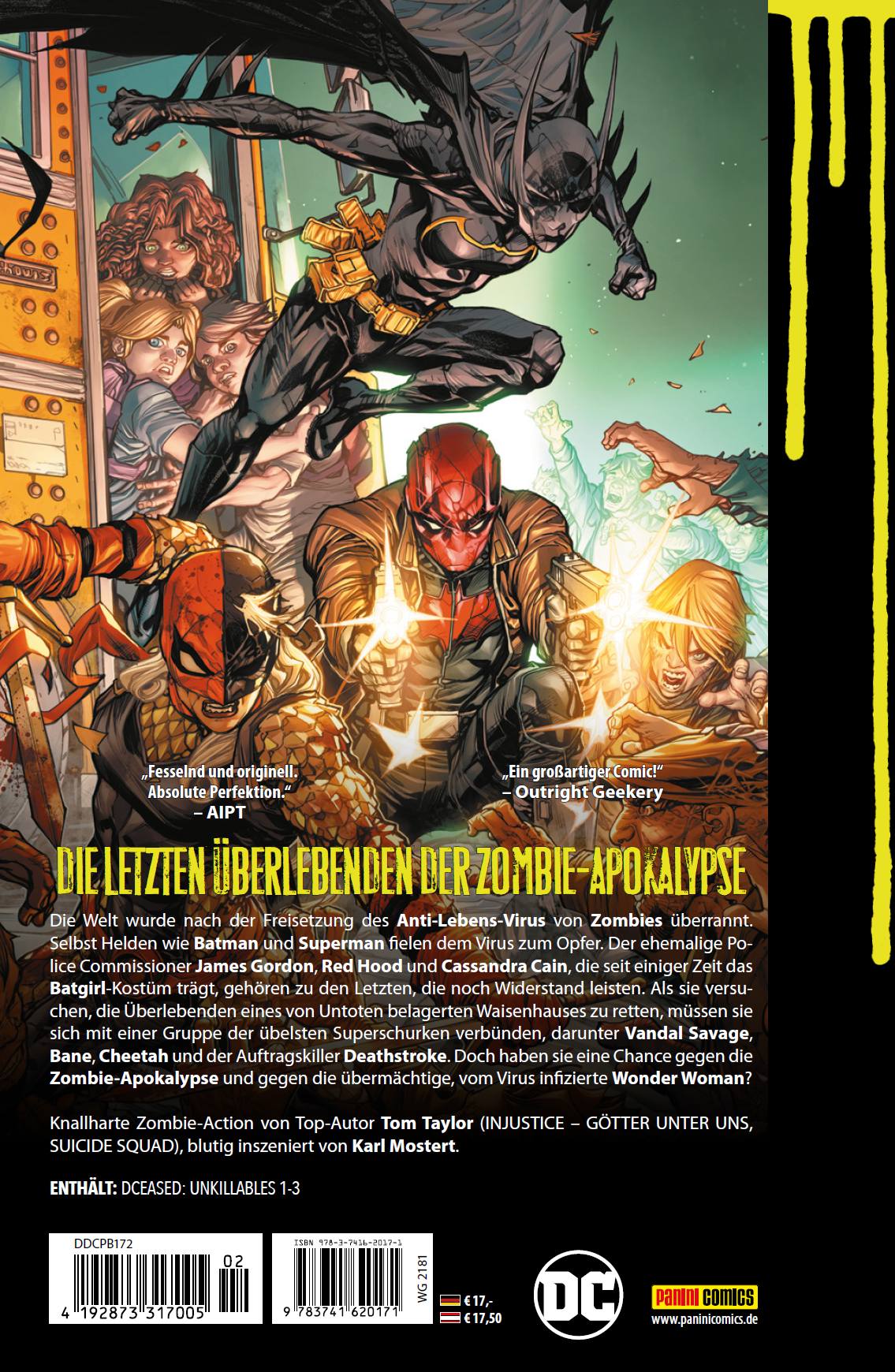 DIE LETZTEN ÜBERLEBENDEN DER ZOMBIE-APOKALYPSEDie Welt wurde nach der Freisetzung des Anti-Lebens-Virus von Zombies überrannt. Selbst Helden wie Batman und Superman fielen dem Virus zum Opfer. Der ehemalige Police Commissioner James Gordon, Red Hood und Cassandra Cain, die seit einiger Zeit das Batgirl-Kostüm trägt, gehören zu den Letzten, die noch Widerstand leisten. Als sie versuchen, die Überlebenden eines von Untoten belagerten Waisenhauses zu retten, müssen sie sich mit einer Gruppe der übelsten Superschurken verbünden, darunter Vandal Savage, Bane, Cheetah und der Auftragskiller Deathstroke. Doch haben sie eine Chance gegen die Zombie-Apokalypse und gegen die übermächtige, vom Virus infizierte Wonder Woman?Knallharte Zombie-Action von Top-Autor Tom Taylor (INJUSTICE - GÖTTER UNTER UNS, SUICIDE SQUAD), blutig inszeniert von Karl Mostert.ENTHÄLT: DCEASED: UNKILLABLES 1-3