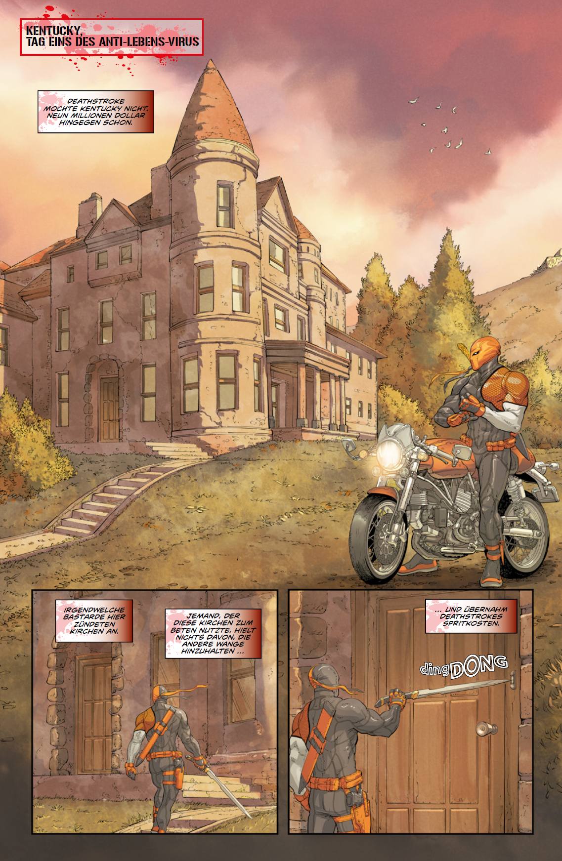 ANTIHELDEN, SCHURKEN, ZOMBIESBestsellerautor Tom Taylor ist ein Spezialist für ebenso düstere wie famose Alternativweltgeschichten mit den Ikonen von DC. Nach dem finsteren Spektakel INJUSTICE - GÖTTER UNTER UNS lieferte Taylor mit DC-HORROR: DER ZOMBIE-VIRUS den nächsten Kracher über eine andere Realität der bekannten Helden und Schurken. Dort begann alles damit, dass der kosmische Gott Darkseid den irdischen Helden Cyborg dazu missbrauchte, den verhängnisvollen Anti-Lebens-Virus freizusetzen. Der vernichtete in der Folge erst Darkseids Welt Apokolips - und kam dann mit Cyborg auf die Erde. Der Held von der Justice League versuchte, den Computervirus hinter seiner Firewall zu halten, doch er brach aus und verbreitete sich über die Netzwerke und Smartphones rasend schnell, woraufhin sich viele einfache Bürger, aber auch Superwesen in eine besonders gefährliche Art von Zombie verwandelten. Selbst Batman wurde infiziert und von Alfred in der Bat-Höhle erschossen. Die Welt versank schnell im Chaos der Zombie-Apokalypse - die Explosion des Helden Captain Atom zerstörte mehrere Städte. Sogar Superman wurde am Ende vom Virus übermannt und infizierte seinerseits im Kampf die Amazone Wonder Woman. Supermans Frau Lois Lane, ihr Sohn Jonathan sowie Bruce Waynes Sohn und Nachfolger Damian verließen mit den letzten Überlebenden die Erde und fanden in den Tiefen des Weltalls eine neue Heimat. Dieser neue Band zwischen Horror und Action setzt am Anfang der Infektion ein. Im Mittelpunkt stehen zwei Söldner und Antihelden: Jason Todd, der nach Dick Grayson zum zweiten Robin und dann vom Joker umgebracht wurde, später durch eine Lazarusgrube ins Leben zurückkehrte und zum knallharten Antihelden Red Hood wurde; und der skrupellose Auftragskiller Slade Wilson, genannt Deathstroke, dessen Körper durch Hightech-Implantate verbessert wurde und der ein schwieriges Verhältnis zu seiner Tochter Rose alias Ravager hat. Das ist ihre Geschichte nach dem plötzlichen Ende der Zivilisation ...