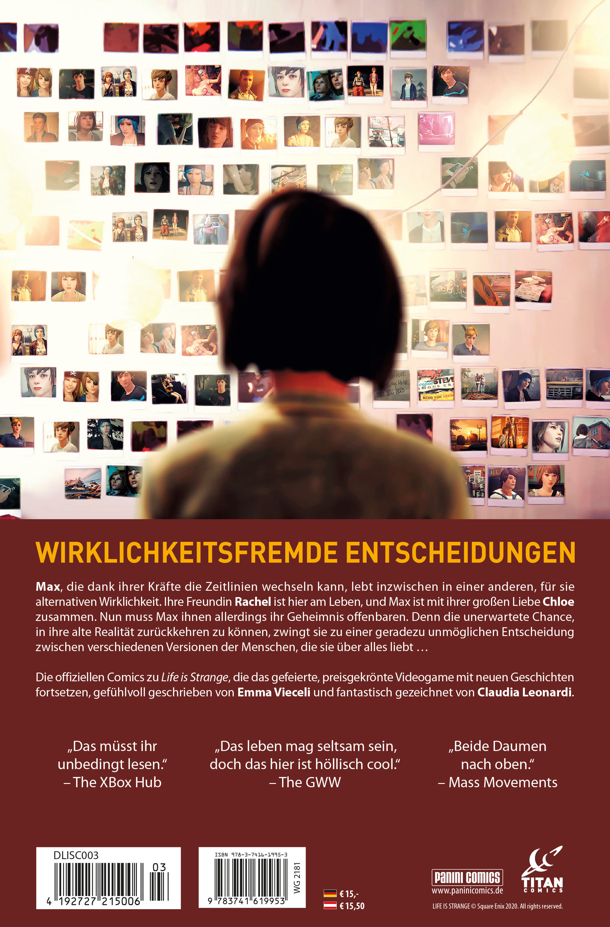 WIRKLICHKEITSFREMDE ENTSCHEIDUNGENMax, die dank ihrer Kräfte die Zeitlinien wechseln kann, lebt inzwischen in einer anderen, für sie alternativen Wirklichkeit. Ihre Freundin Rachel ist hier am Leben, und Max ist mir ihrer großen Liebe Chloe zusammen. Nun muss Max ihnen allerdings ihr Geheimnis offenbaren. Denn die unerwartete Chance, in ihre alte Realität zurückzukehren zu können, zwingt sie zu einer geradezu unmöglichen Entscheidung zwischen verschiedenen Versionen der Menschen, die sie über alles liebt...Die offiziellen Comics zu Life ist Strange, die das gefeierte, preisgekrönte Videogame mit neuen Geschichten fortsetzen, gefühlvoll geschrieben von Emma Vieceli und fantastisch gezeichnet von Claudia Leonardi.