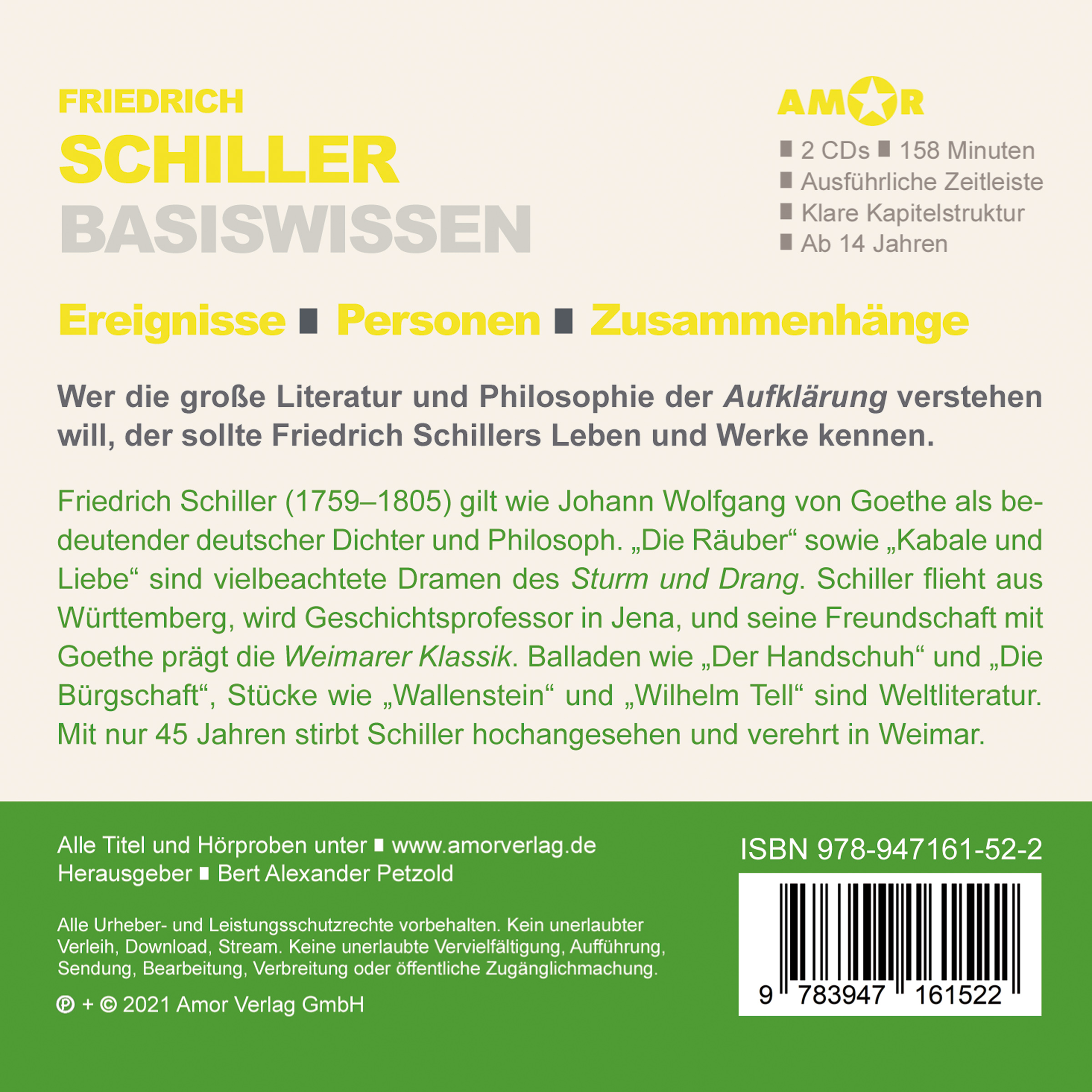 Der erfahrene Autor und Herausgeber Bert Alexander Petzold nimmt uns mit auf eine faktenreiche Literaturreise und erläutert verständlich, unterhaltsam und strukturiert Basiswissen zum wichtigsten deutschen Dramatiker des "Sturm und Drang" Friedrich Schiller.
