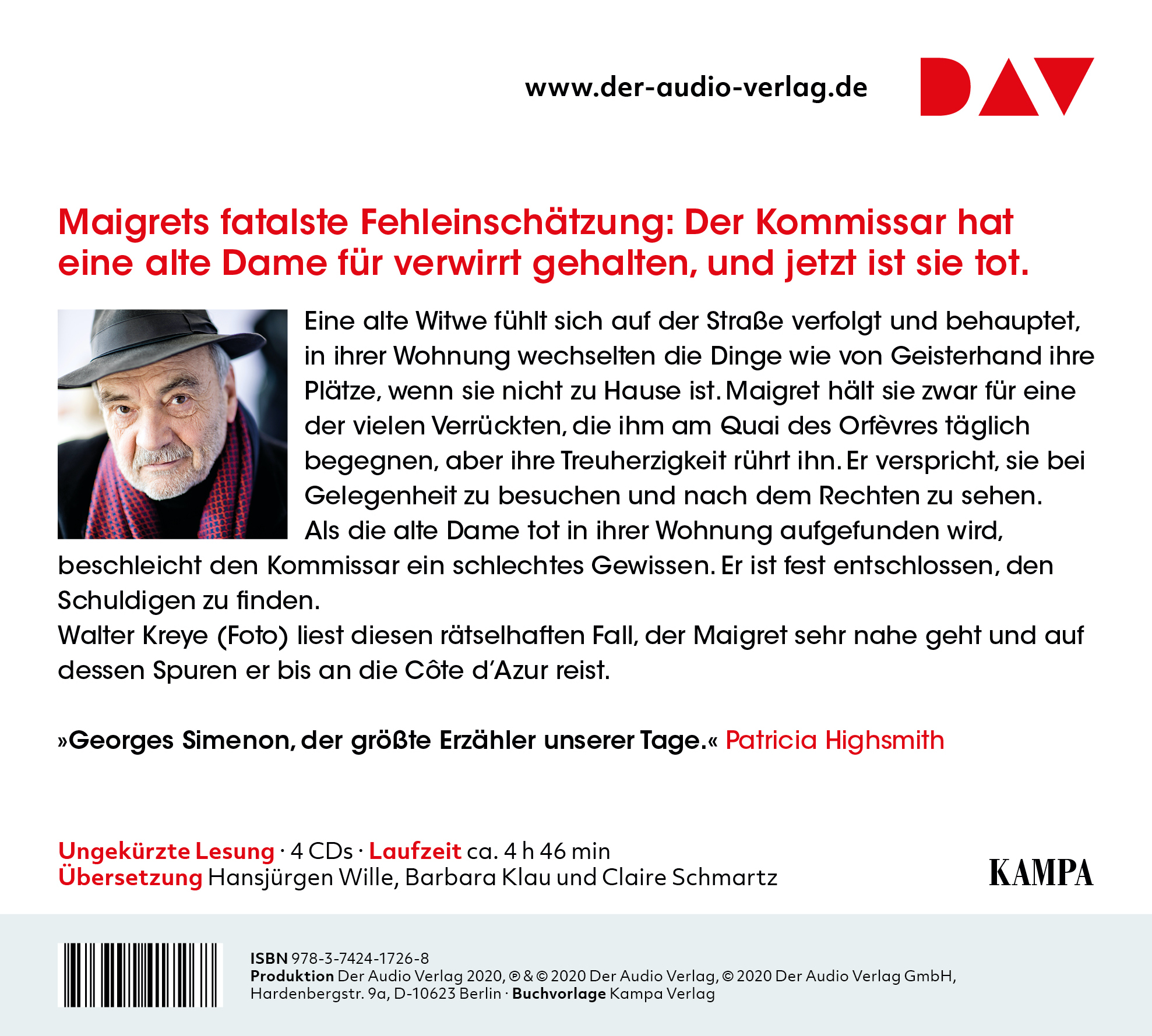 Walter Kreye, geboren 1942, spielte an Bühnen wie dem Hamburger Schauspielhaus, dem Thalia Theater, dem Staatstheater Stuttgart sowie an der Schaubühne Berlin. Der mit dem Grimme-Preis ausgezeichnete Schauspieler wurde durch zahlreiche Film- und Fernsehrollen bekannt, u. a. als Hauptkommissar Kress in »Der Alte« und durch die Netflix-Serie »Dark«. Der beliebte Hörbuchsprecher liest alle Fälle von Kommissar Maigret in der Edition Simenon ein.