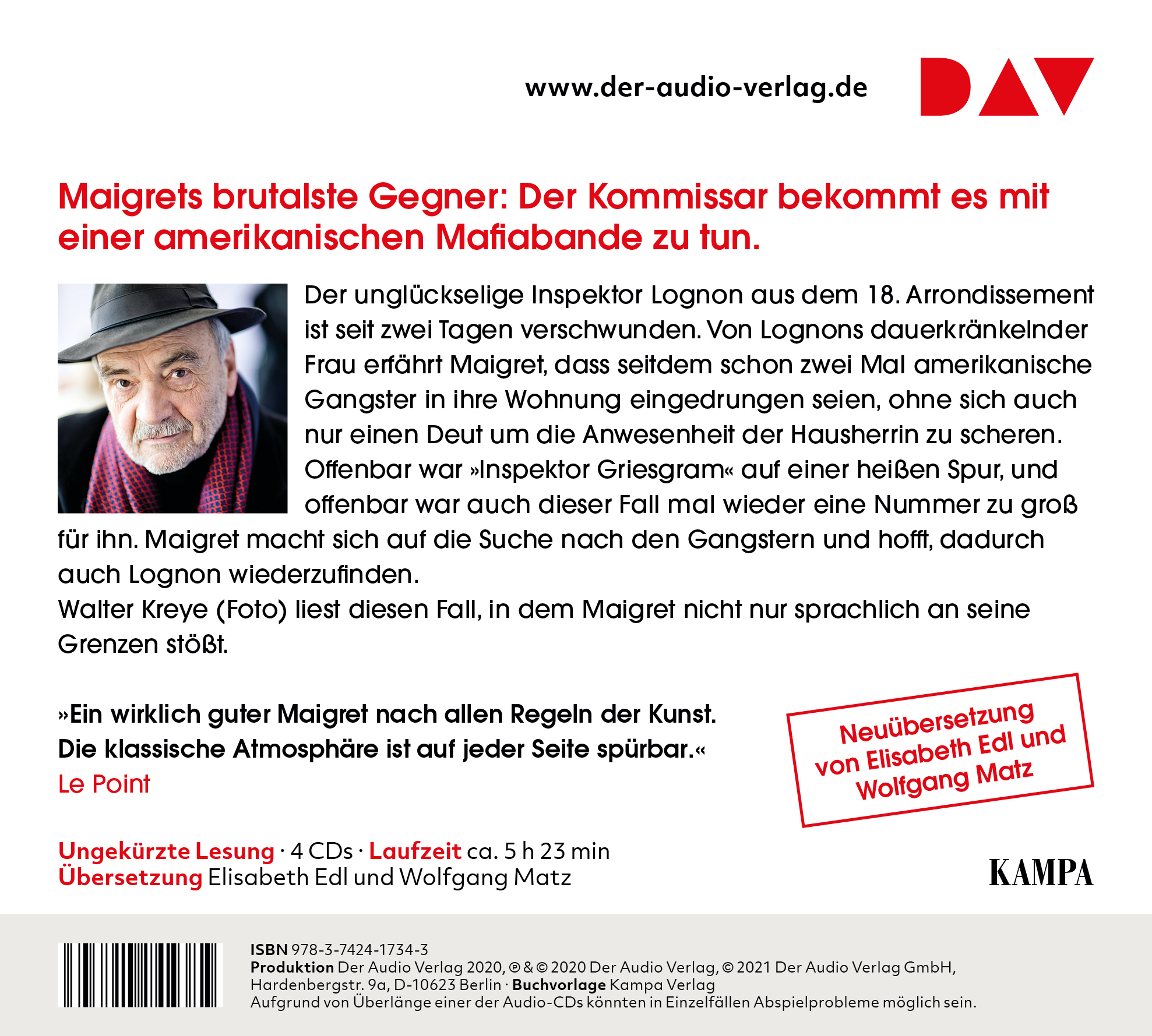 Walter Kreye, geboren 1942, spielte an Bühnen wie dem Hamburger Schauspielhaus, dem Thalia Theater, dem Staatstheater Stuttgart sowie an der Schaubühne Berlin. Der mit dem Grimme-Preis ausgezeichnete Schauspieler wurde durch zahlreiche Film- und Fernsehrollen bekannt, u. a. als Hauptkommissar Kress in »Der Alte« und durch die Netflix-Serie »Dark«. Der beliebte Hörbuchsprecher liest alle Fälle von Kommissar Maigret in der Edition Simenon ein.