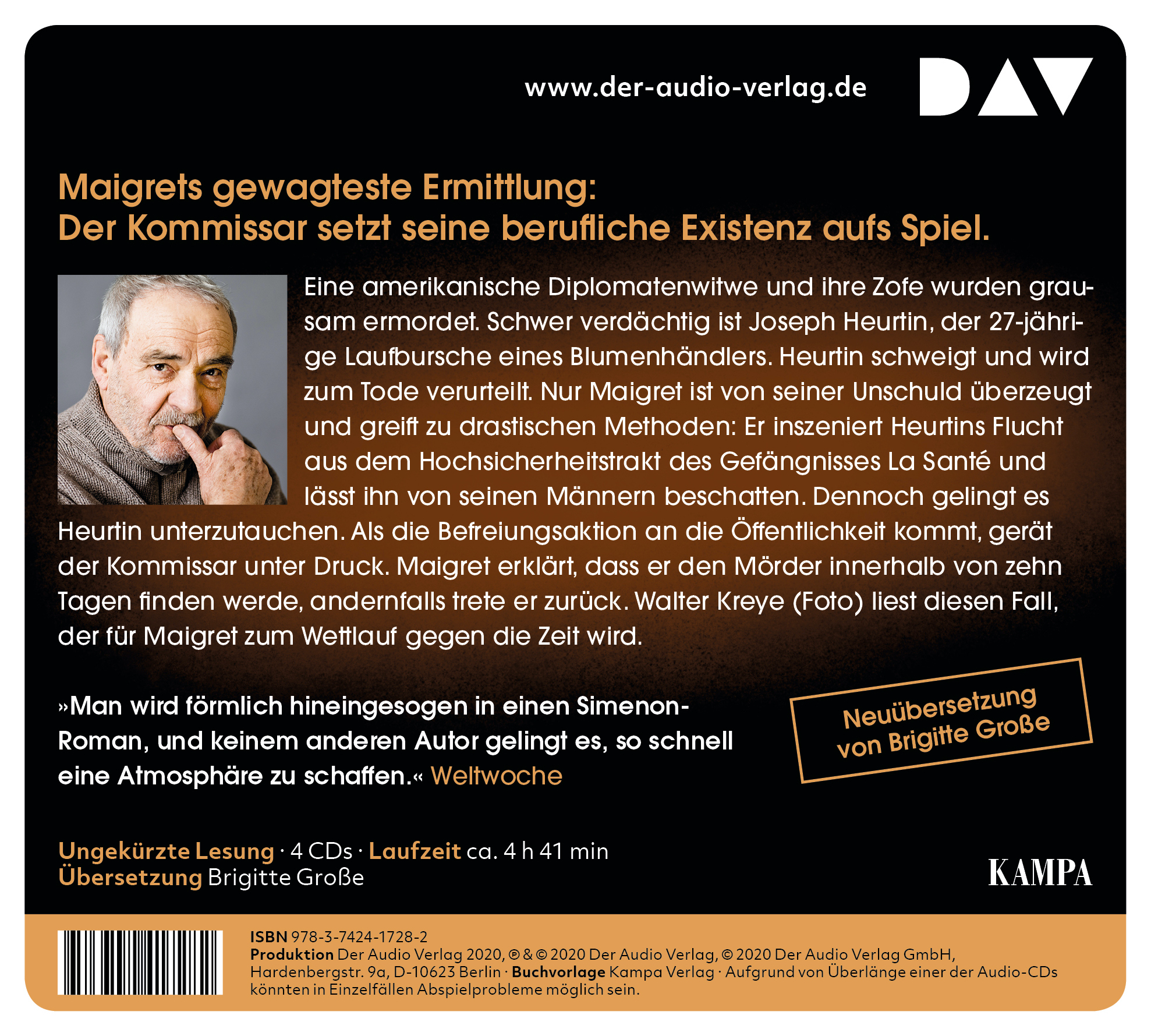 Walter Kreye, geboren 1942, spielte an Bühnen wie dem Hamburger Schauspielhaus, dem Thalia Theater, dem Staatstheater Stuttgart sowie an der Schaubühne Berlin. Der mit dem Grimme-Preis ausgezeichnete Schauspieler wurde durch zahlreiche Film- und Fernsehrollen bekannt, u. a. als Hauptkommissar Kress in »Der Alte« und durch die Netflix-Serie »Dark«. Der beliebte Hörbuchsprecher liest alle Fälle von Kommissar Maigret in der Edition Simenon ein.