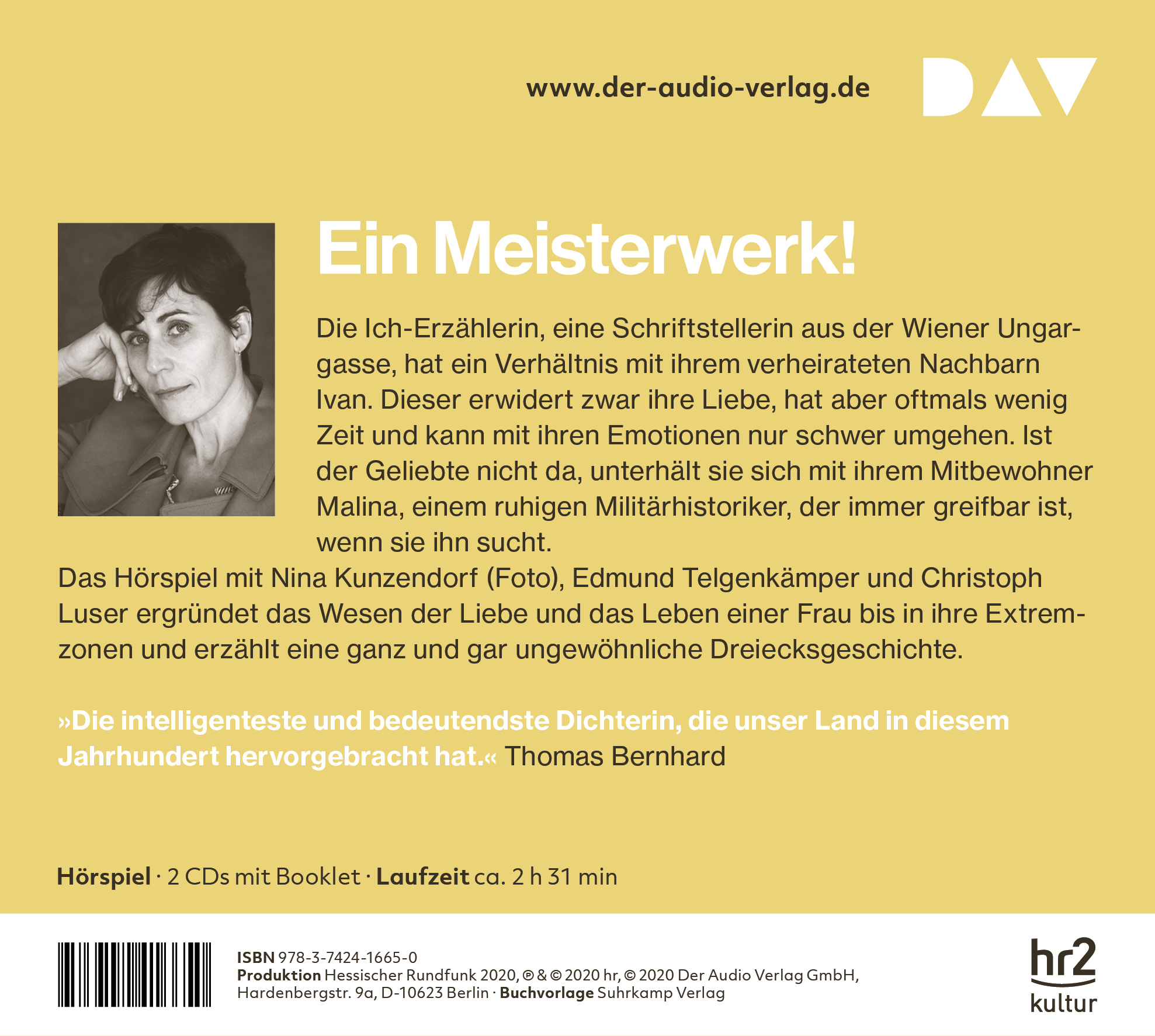 | Schlagworte | Dreiecksgeschichte • Frau:Einsamkeit • Gefühle • Gefühle • Intellektuelle • Ivan • Liebe • Malina • Roman • Vater • Verzweiflung • Wien |