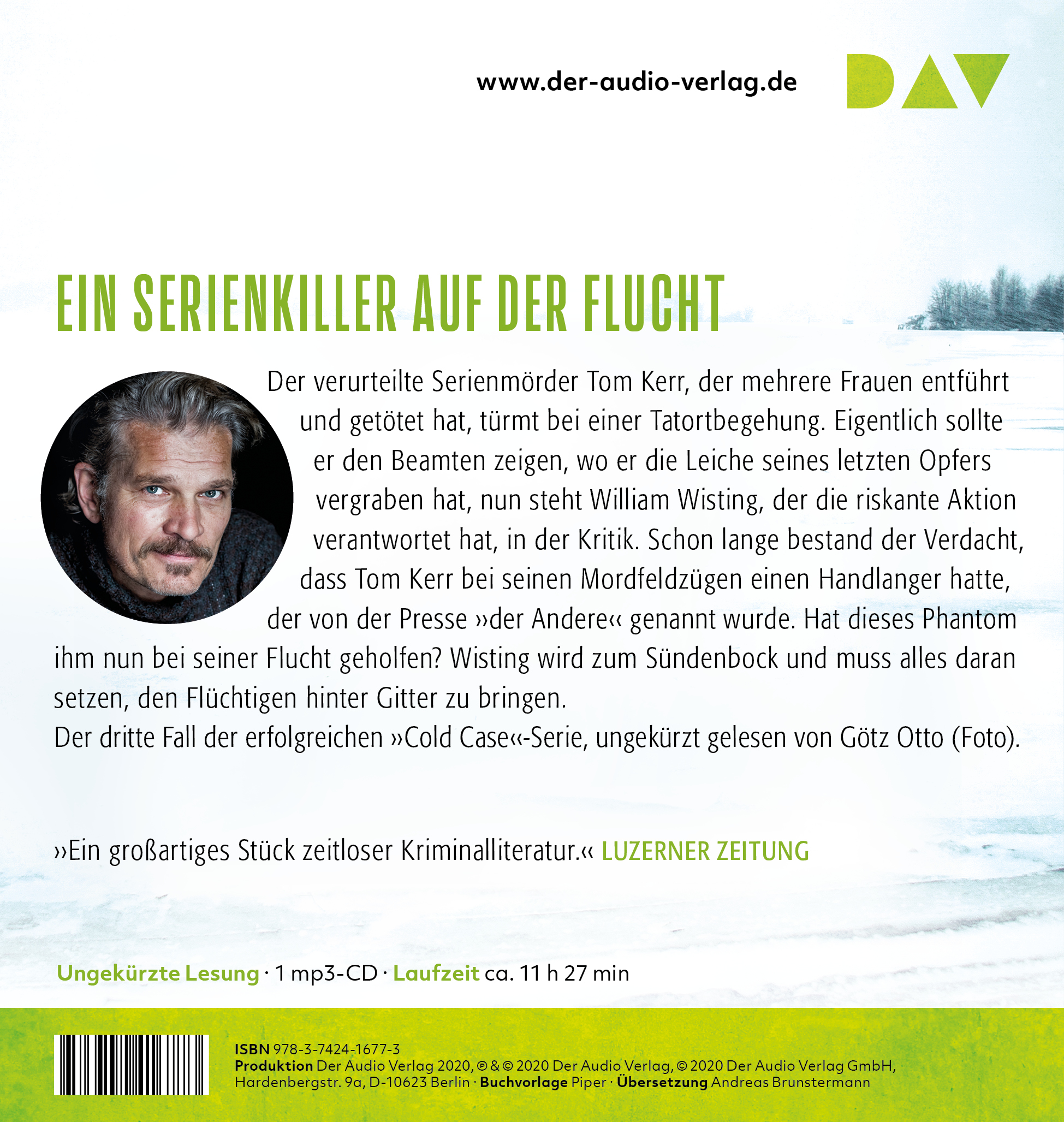 Götz Otto, 1967 geboren, stand auf zahlreichen großen Theaterbühnen. Einem breiten Publikum wurde er durch seine Rolle im James-Bond-Film »Der Morgen stirbt nie« bekannt. Für DAV liest er die Bestseller um den Polizeikommissar Wisting ein.