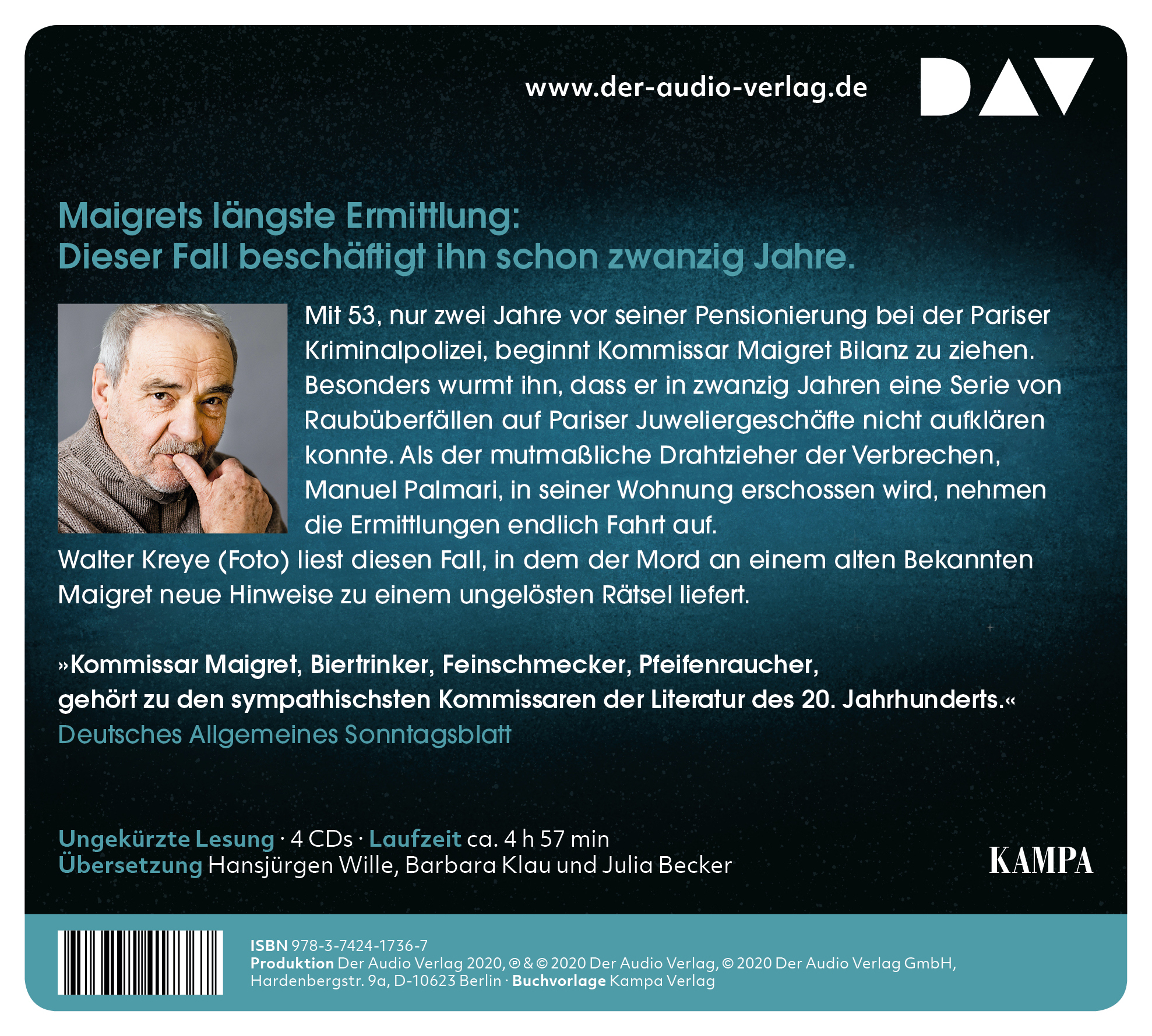 Walter Kreye, geboren 1942, spielte an Bühnen wie dem Hamburger Schauspielhaus, dem Thalia Theater, dem Staatstheater Stuttgart sowie an der Schaubühne Berlin. Der mit dem Grimme-Preis ausgezeichnete Schauspieler wurde durch zahlreiche Film- und Fernsehrollen bekannt, u. a. als Hauptkommissar Kress in »Der Alte« und durch die Netflix-Serie »Dark«. Der beliebte Hörbuchsprecher liest alle Fälle von Kommissar Maigret in der Edition Simenon ein.