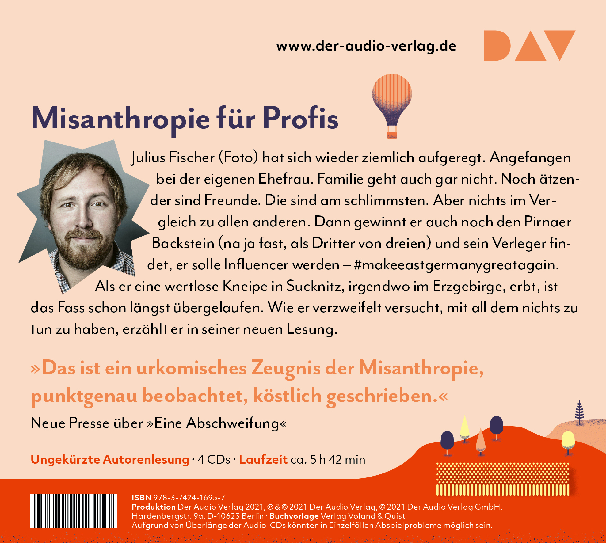 Julius Fischer, geboren 1984 in Gera, ist Autor, Liedermacher und Kleinkünstler. Er ist Mitglied diverser Lesebühnen, u. a. der »Lesedüne« mit Marc-Uwe Kling. Er spielt in der Band »The Fuck Hornisschen Orchestra« und präsentiert zusammen mit Christian Meyer die TV-Show »Comedy mit Karsten« im MDR. Seit 2018 ist er neben Olaf Schubert in der ARD-Show »Olaf macht Mut« zu sehen. Zuletzt erschien von ihm »Eine Abschweifung. Ich hasse Menschen«.