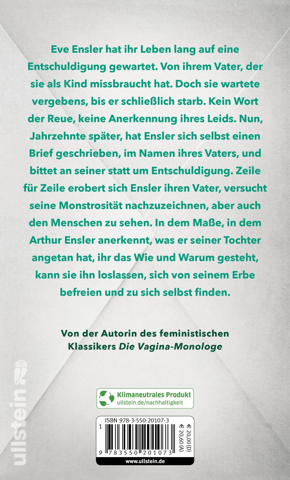 Kein Wort der Reue, keine Anerkennung ihres Leids. Nun, Jahrzehnte später, hat Ensler sich selbst einen Brief geschrieben, im Namen ihres Vaters, und bittet an seiner statt um Entschuldigung. Zeile für Zeile erobert sich Ensler ihren Vater, versucht seine Monstrosität nachzuzeichnen, aber auch den Menschen zu sehen.