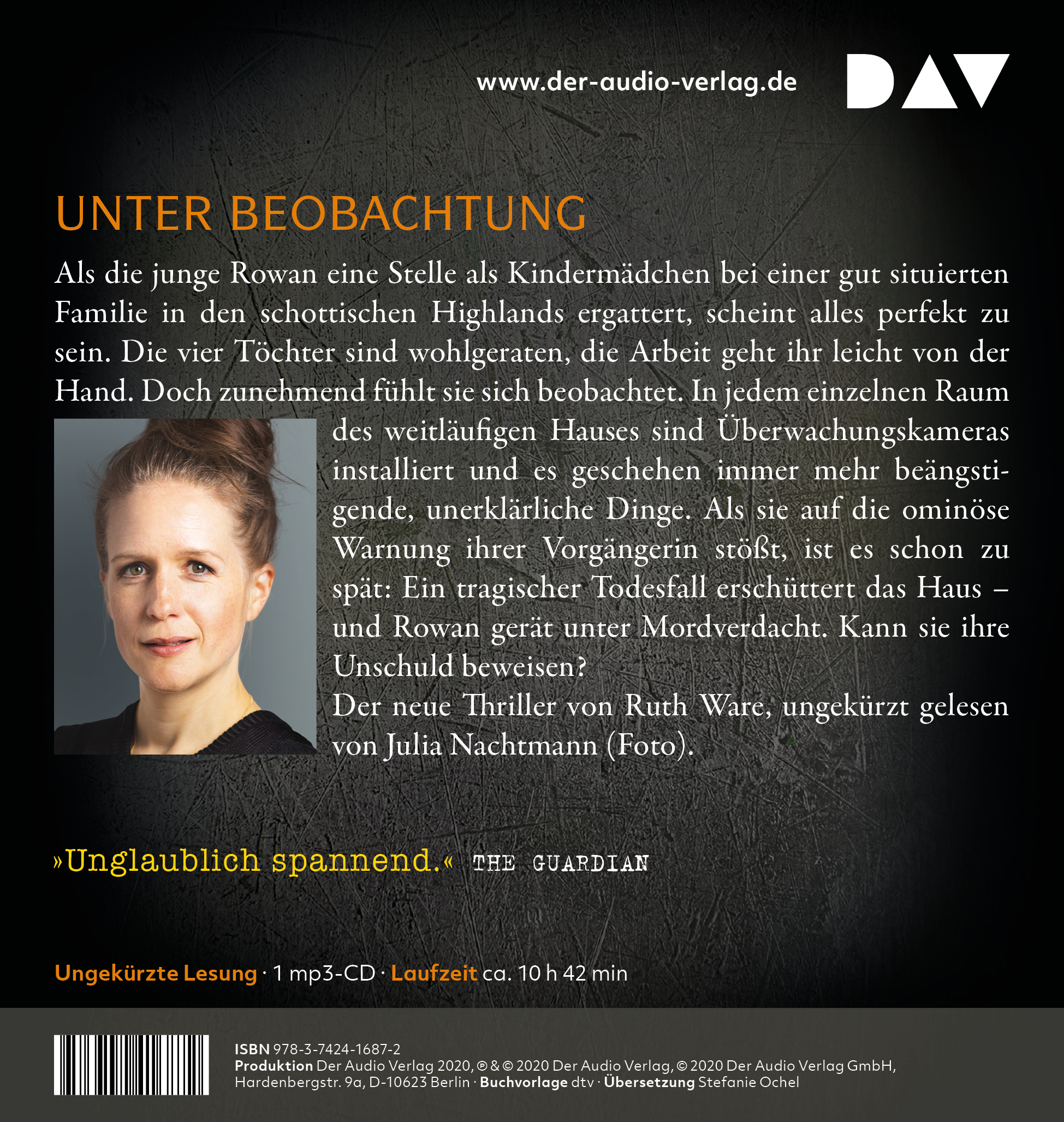 Julia Nachtmann, 1981 geboren, wurde u.a. mit dem Boy-Gobert-Preis ausgezeichnet und war in Kinoproduktionen wie »Die Kirche bleibt im Dorf« und Fernsehserien wie »Der Dicke« zu sehen. Sie ist u.a. Sprecherin der Krimi-Bestseller von Nele Neuhaus und liest für DAV alle Hörbücher von Ruth Ware ein.